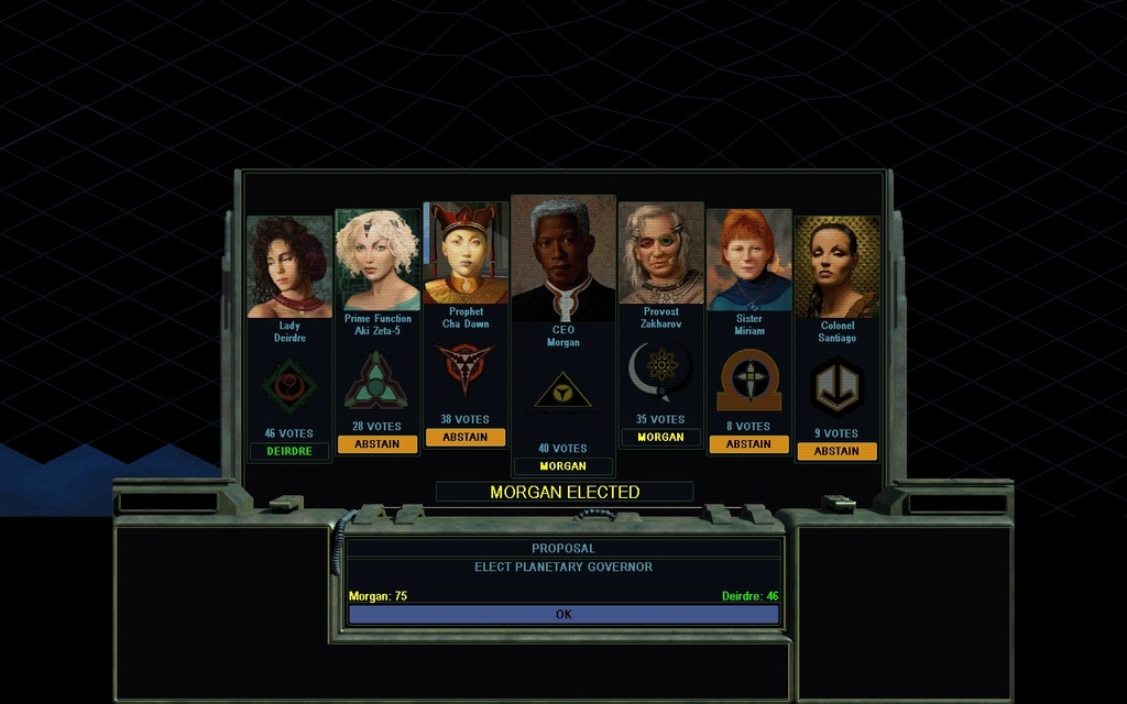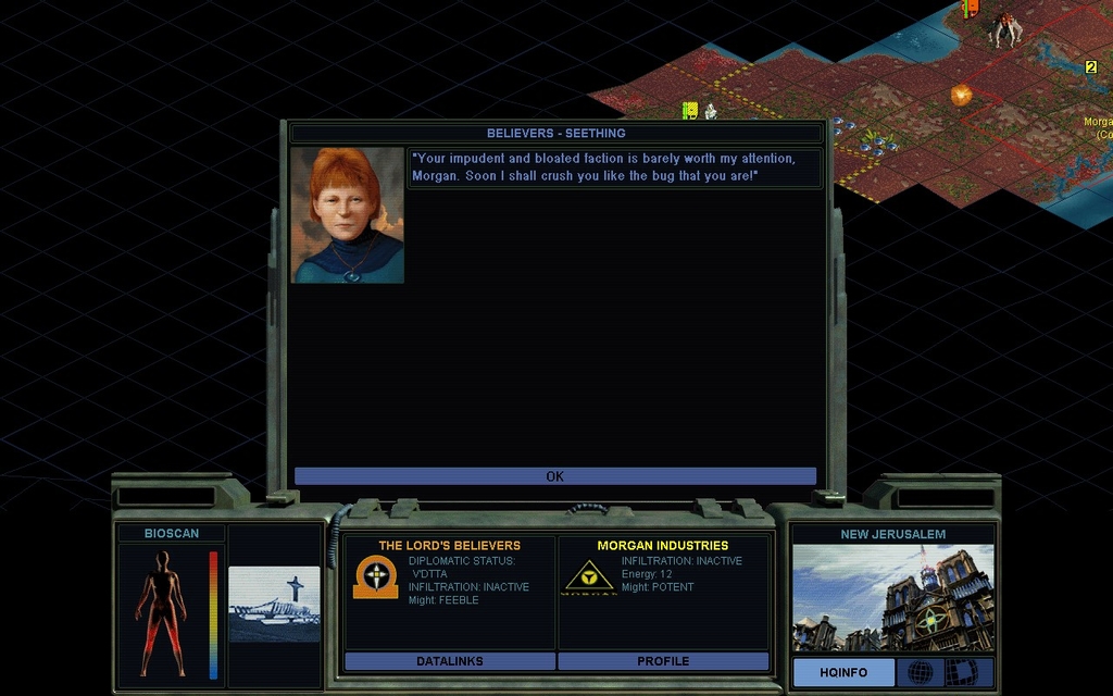 In the version I'm testing, Miriam has no RESEARCH penalties, no compulsion to go Fundamentalist, and no Fanatic attack bonus. However I did give her +1 MORALE and I've made her Aggressive. We're about to see whether that was a good idea on my part. Fighting Conqueror Marr would be worse, due to his ability to direct his research.
