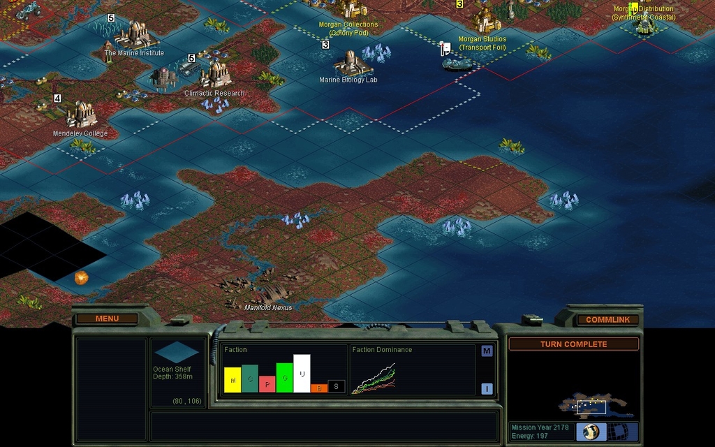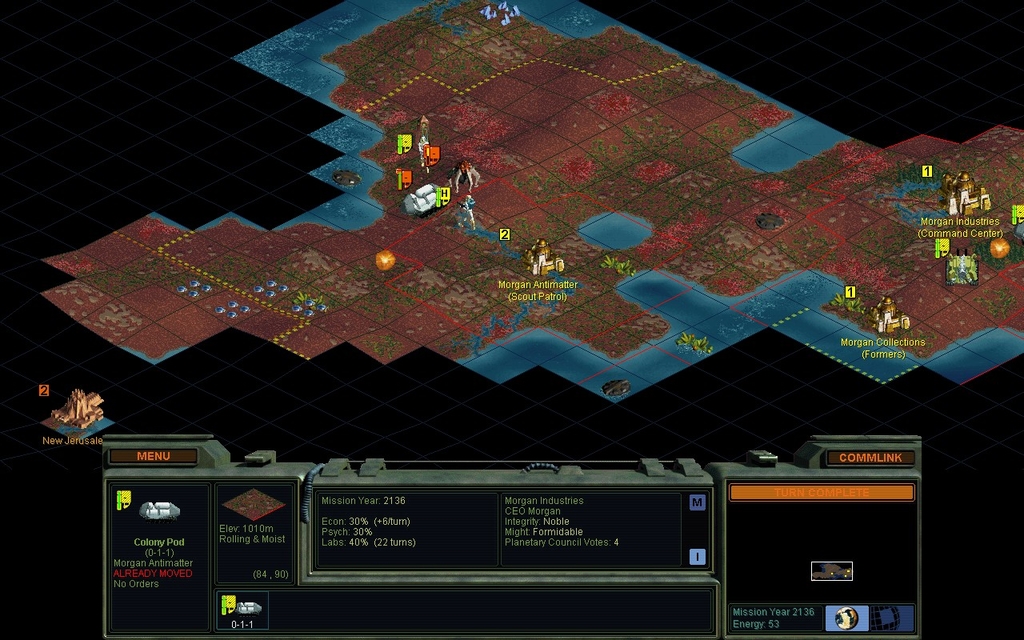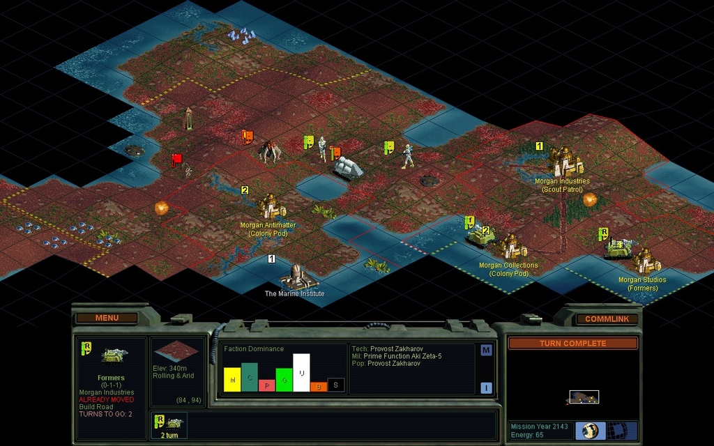 I had a ratty start, bad land, fungus everywhere, so I walked my colony pods in opposite directions until I settled on some rivers without fungus next to my cities. I contacted Zhakarov and Miriam. I've blown pretty much all of my money buying techs from Zhakarov.