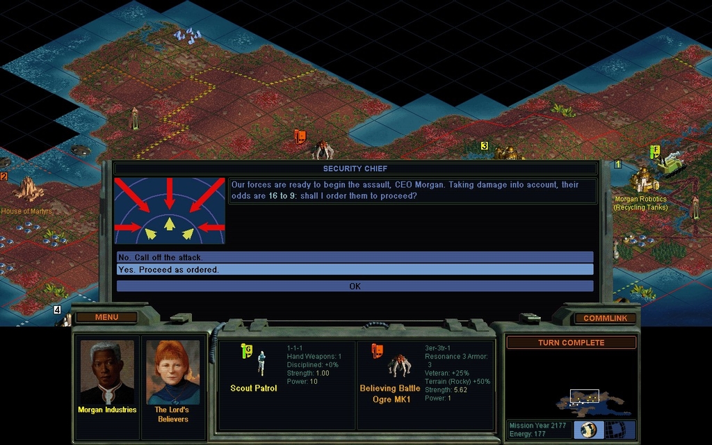 MY 2126. Surprisingly, Miriam does not attack with her Ogre, even though she could totally blow my Scout to bits. I will take that behavior for as long as I can! With only 2 cities I need all the help I can get. I looked at the unit's AI "plan" just to make sure I didn't do something dumb with it. I set it to "-1 Autocalculate" a long time ago. The stock value is "0 Offensive". Well the main armament isn't all that tough and the armor isn't invulnerable to stuff, especially not mindworms, so I don't know how the AI ultimately feels about Battle Ogres.