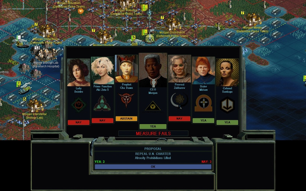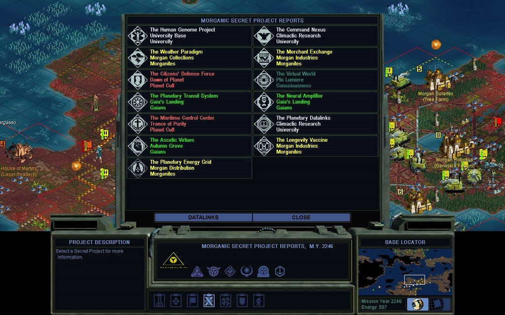 MY 2145. I research Industrial Base and go Capitalist, which gives me +1 ECONOMY +1 INDUSTRY -2 PLANET. I get a map of Miriam's territory from Zhakarov. She's only got 2 cities. Zhakarov won't trade me anything for Industrial Base, because he's working on the Planetary Datalinks. I made Secrets of the Human Brain a D2 tech and put the Datalinks on it, figuring that project is best to have early, and not terribly harmful to game balance in any event. I did get a number of techs from Zhakarov initially. I'm inclined to think that slowing down the tech trading economy, due to his desire to build the Datalinks, is a good thing.