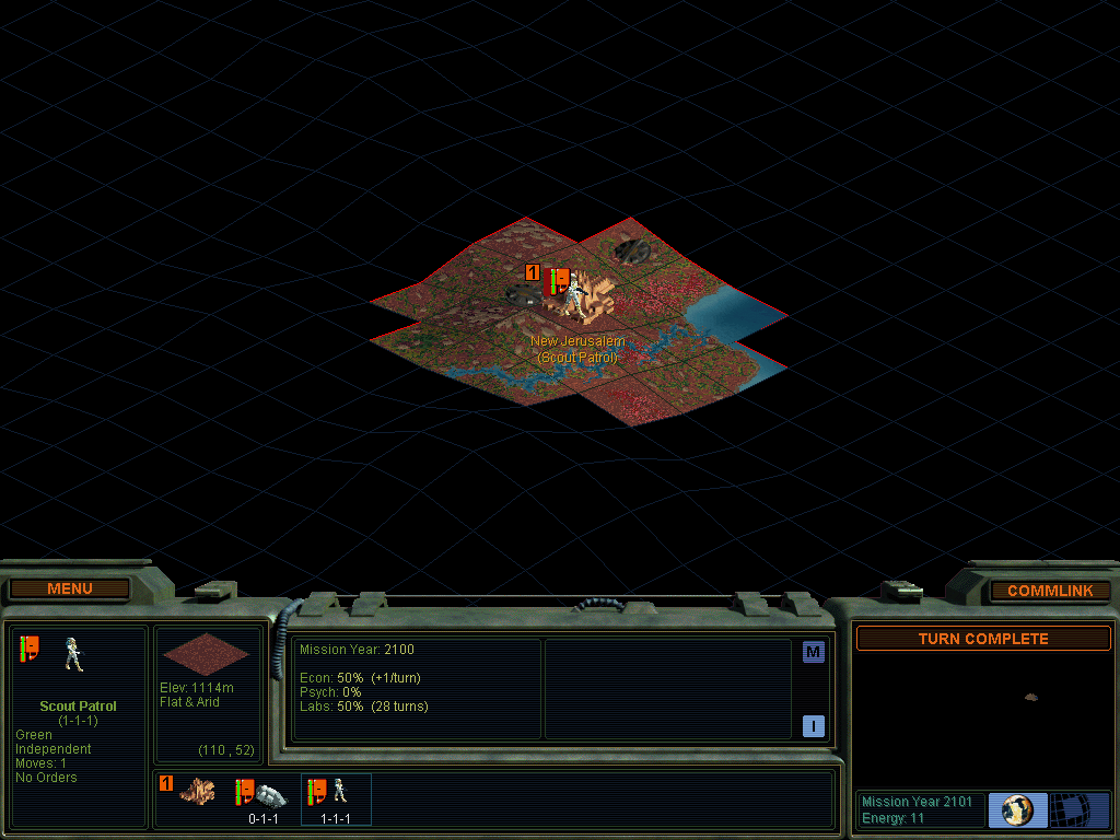 So good news, I may be at the bottom of the power graph because of losing so many colony pods, but Lular can't be doing to much better. She truced me for some EC, and it turns out that there is a tiny and pretty defensible land bridge between us to the north. I have sensors built up there in the vicinity of that base to keep an eye on things, and I have synthmetal armor now. No lasers yet.