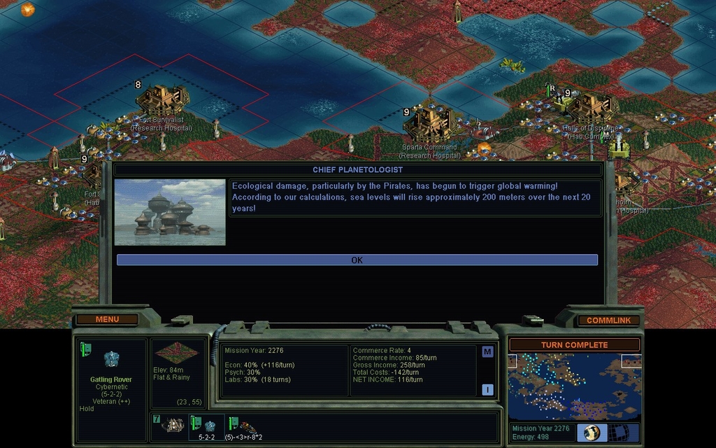 MY 2277.  After a 2 day break, I come back to the game wondering how to resolve it.  Taking out the Pirates is the obvious course of action for the Spartans, but I don't like stabbing allies.  Now however, they've given me a sort of causus belli, their wanton disregard for anybody else's land on Planet.  I'm not going to openly declare war, but I'm going to stop being nice about my Values choices.  It's time for some Knowledge.  I drop to -2 POLICE, so police no longer do me any good.  I adjust my budget to 30-30-40 to put more into my Labs.  I also really want Advanced Ecological Engineering so I'm switching my research focus to Build.