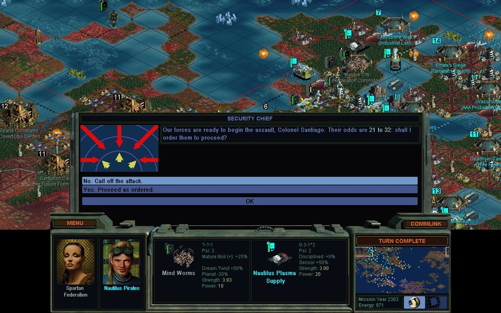 MY 2302.  Amazingly, his Disciplined probe team attacks and kills my Elite probe team, which doesn't seem even vaguely fair or appropriate.  Both were fission units.  I kill it and then succeed at total thought control of the base.  It costs me 1400 credits or so.  I think about putting a Punishment Sphere on it, but I've now got a +1 POLICE rating so I just put some troops and police units in there.
