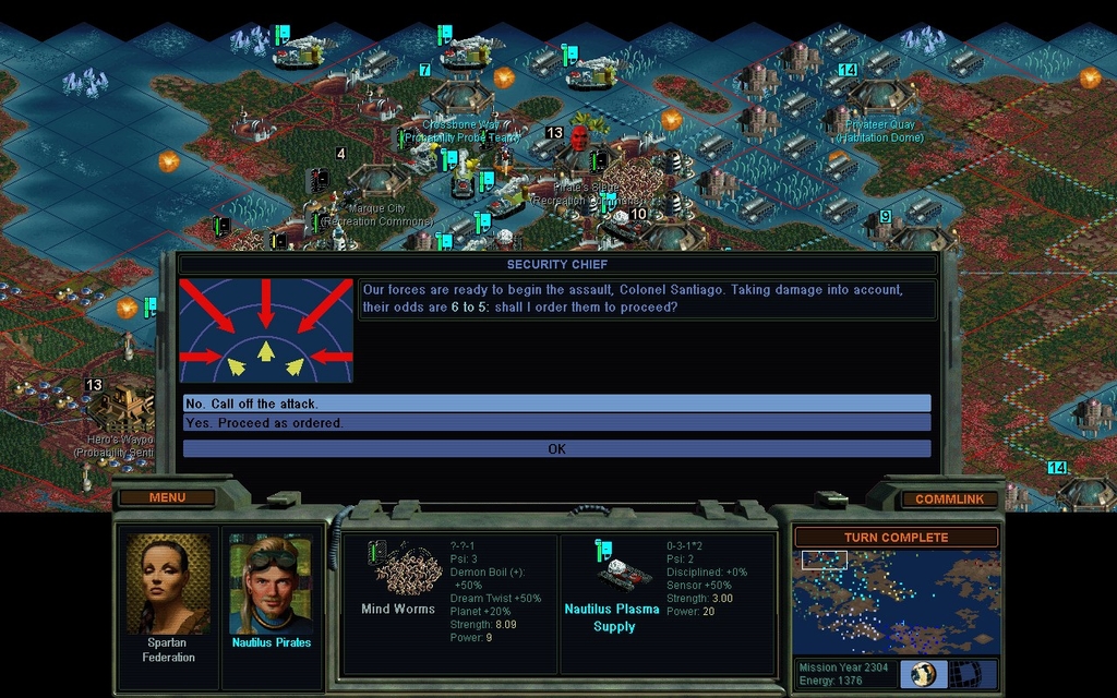 MY 2302.  Amazingly, his Disciplined probe team attacks and kills my Elite probe team, which doesn't seem even vaguely fair or appropriate.  Both were fission units.  I kill it and then succeed at total thought control of the base.  It costs me 1400 credits or so.  I think about putting a Punishment Sphere on it, but I've now got a +1 POLICE rating so I just put some troops and police units in there.