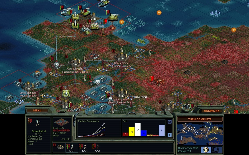 I decide to crawl a mine on behalf of the city that's now building the Pholus Mutagen, at the risk of 15 eco-damage.  Other crawlers, I have them mine on behalf of my threatened city producing an Impact Needlejet, and my city producing a Skunkworks.  The latter is only working a forest as I haven't completed my 4th mine.  Driving a rail to my new peninsula city is more important right now.