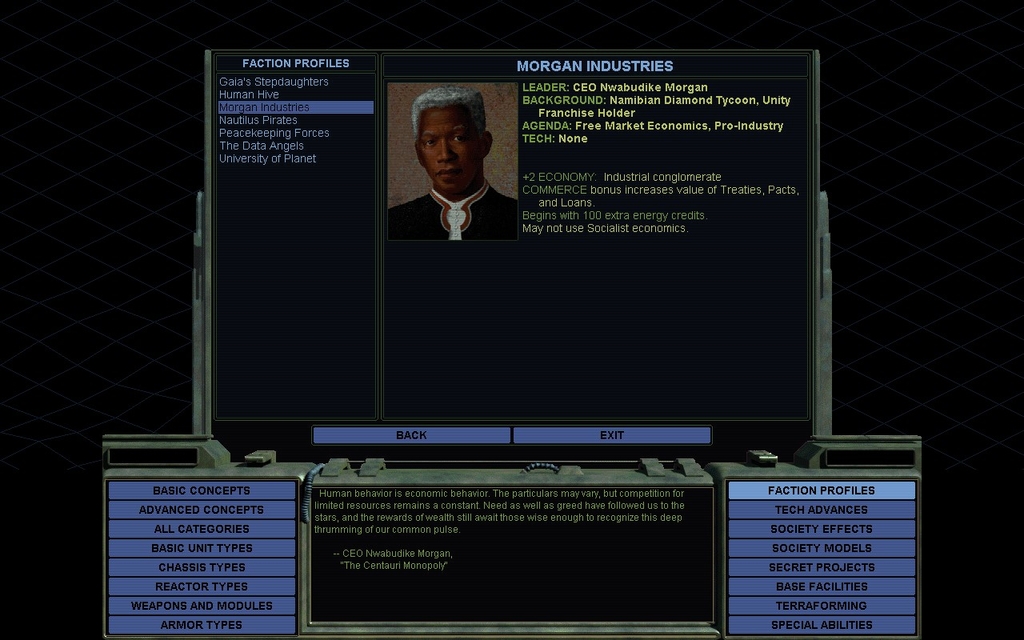 Huge map, 30%..50% land mass with my large continents and large oceans, average settings.  Transcend difficulty, default Thinker mod cost_factor.  Thinker mod's faction placement algorithm disabled by setting faction_placement=0, as it has been unfair in every test game I've played. Random factions.  I draw Morgan, whose main ability is to make money.  The Gaians, Hive, Pirates, Peacekeepers, Data Angels, and University are in the game.  The Peacekeepers are really scary under Thinker mod because they start with +2 GROWTH, making it very easy for them to pop boom.  The game could be dominated by either them or the Pirates, and it would be wise to get them to fight.