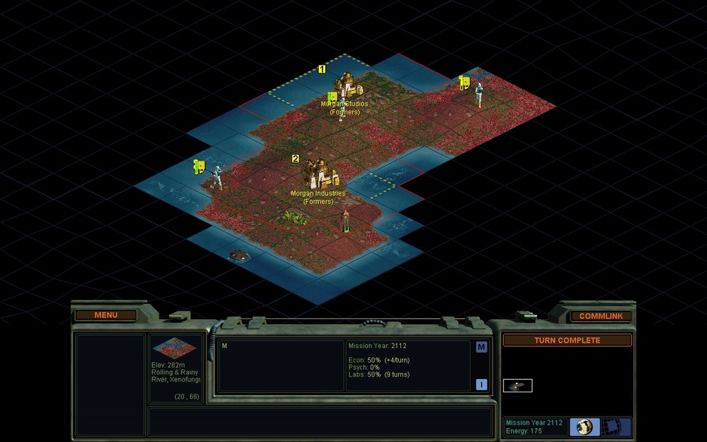 MY 2132.  I learn Doctrine: Flexibility.  I seek trade with the Obstinate Data Angels.  They sell me Monopole Magnets for 100 credits and sign off.  I have removed the fungal patch separating my cities.  I could use Fungicidal Formers real soon now.