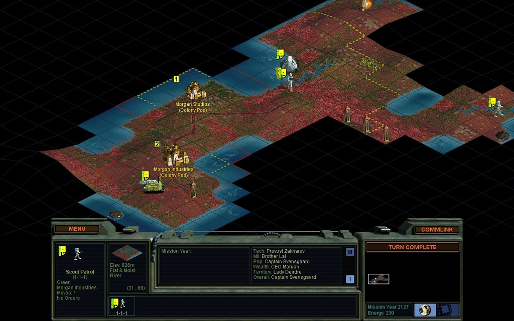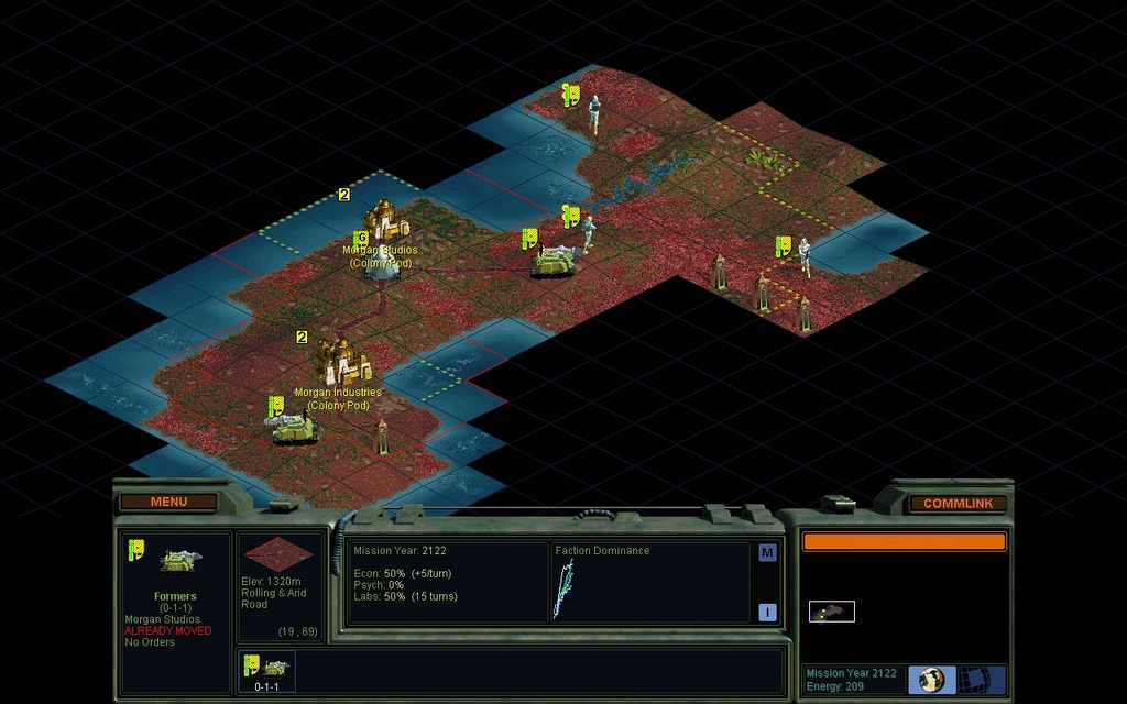 I'm a bit mystified as to why the Data Angels have spread so badly compared to myself.  I have 7 cities to their 4 and will soon have 9.  This despite a large amount of fungus in my way.  Their starting land was dry but they had 3 nutrient specials which should make up for that.  North of them is Rainy land and they simply haven't utilized it.  They have 2 Colony Pods active and 1 in production.  Somehow they've figured out how to make Scout Rovers.  Prototypes are very expensive in my mod, the cheapest being 60 minerals, and I wonder if that could be holding up some of the AI factions.  None of their techs gave them a predefined prototype.