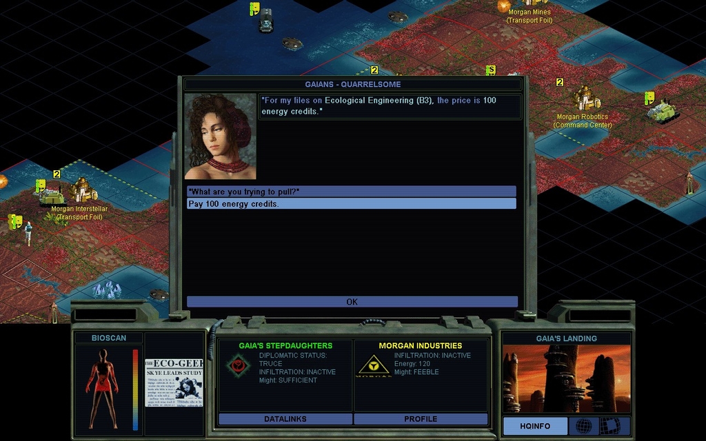 Roze offers to sell me Centauri Genetics, but I decline as I'm trying to finish the Weather Paradigm.