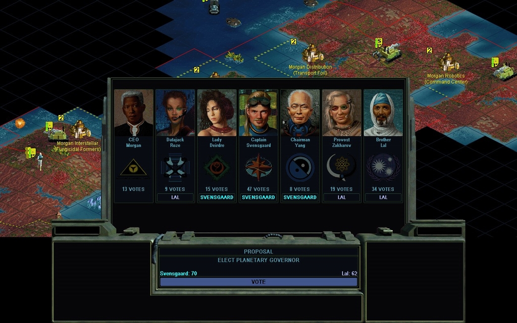 Anyways, Svesngaard is clearly the runaway power faction.  Probably best to vote against him for now.  Lal becomes Governor.  I will end up being Democratic Capitalist Wealth and likely at peace with both of them.