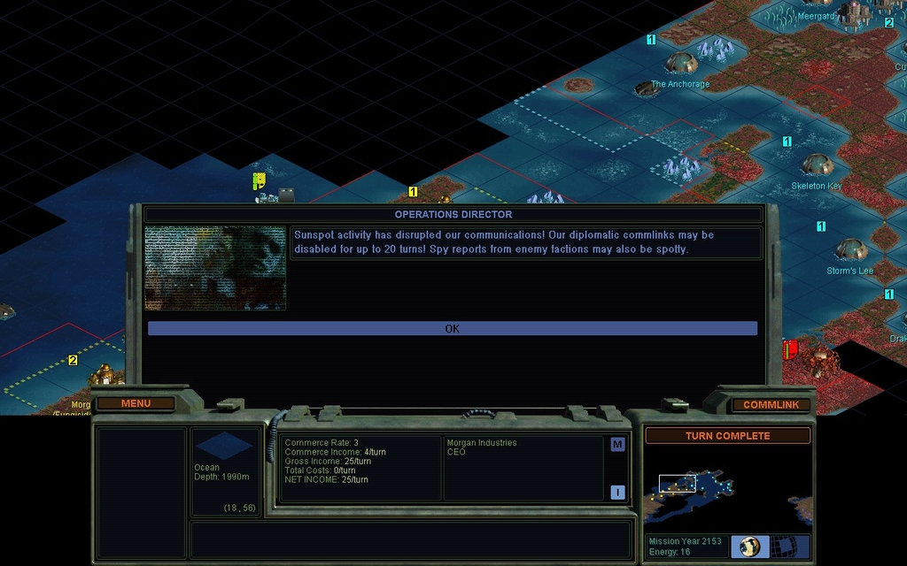MY 2153.  Svensgaard begins the Weather Paradigm, and I haven't yet.  We enter sunspots.  Do you ever get the feeling that the game is cutting you off,  just when you were starting to do well?  Like if I got any more Truces converted to Treaties, I'd be making even more money.  So the game says nah, screw you.  Well I can take it out on my drones, although I almost never do.
