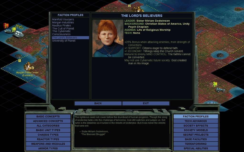 MY 2128.  I meet the Believers and we sign a Treaty.  For version 1.29 of my mod I'm changing them around.  Now they are the only faction in the game that gets a SUPPORT bonus.  You might say I had religion about not doing that, but it's an available axis of diversification that I haven't used since the earliest days of my mod.  Having exhausted all other options, now I take it.  At least it fits the traditional lore of the Believers.  I also got rid of the MORALE bonus I gave them, reinstated the Fanatic Attack bonus, and changed their personality from Aggressive to Erratic.  Their default research foci are Explore, Conquer but a human player could use them as a Build faction if they wanted to.  In the stock game I often did that in concert with the Weather Paradigm, but that's not so easy to do now as the Weather Paradigm comes later.