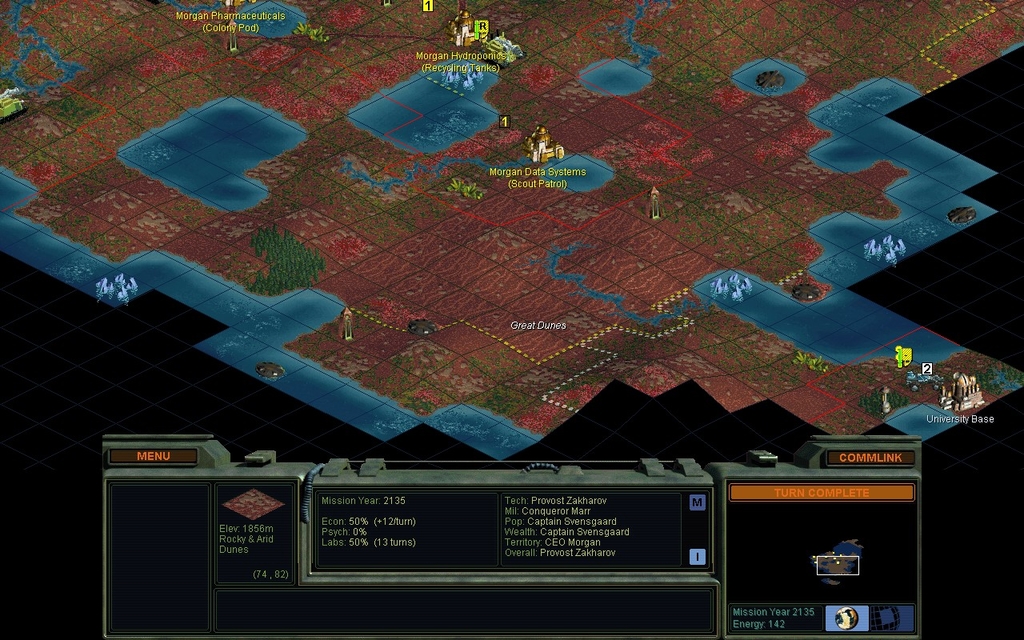 Huge map, 30%..50% land mass with my large continents and large oceans, average settings.  Transcend difficulty, default Thinker mod cost_factor.  Thinker mod's faction placement algorithm disabled by setting faction_placement=0, as it has been unfair in every test game I've played. Random factions.  I draw Morgan again, whose main ability is to make money.  The Usurpers, Pirates, Cult of Planet, Cybernetic Consciousness, Believers, and University are in the game.  I am so sick of the Pirates showing up in every game, but as I just nerfed them, it will be a valuable test.