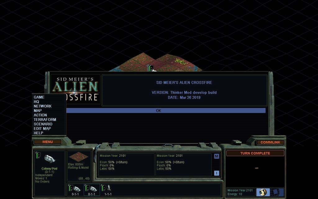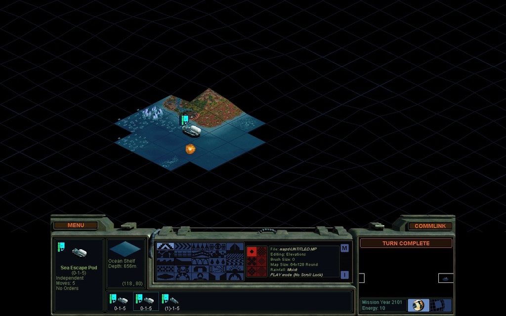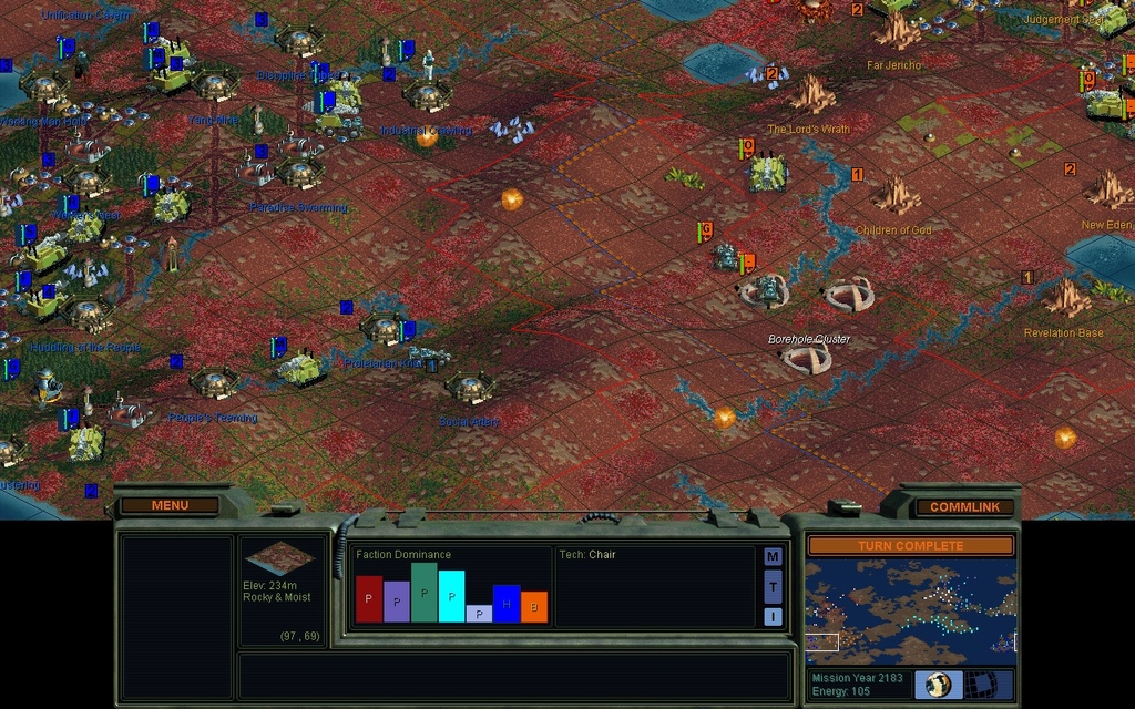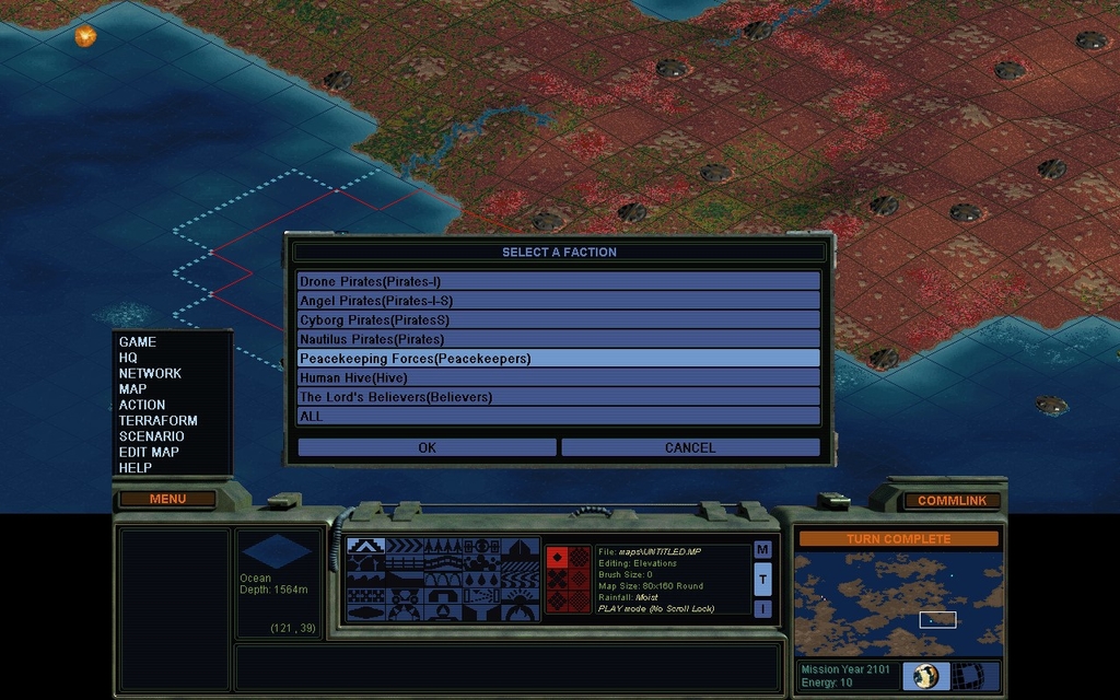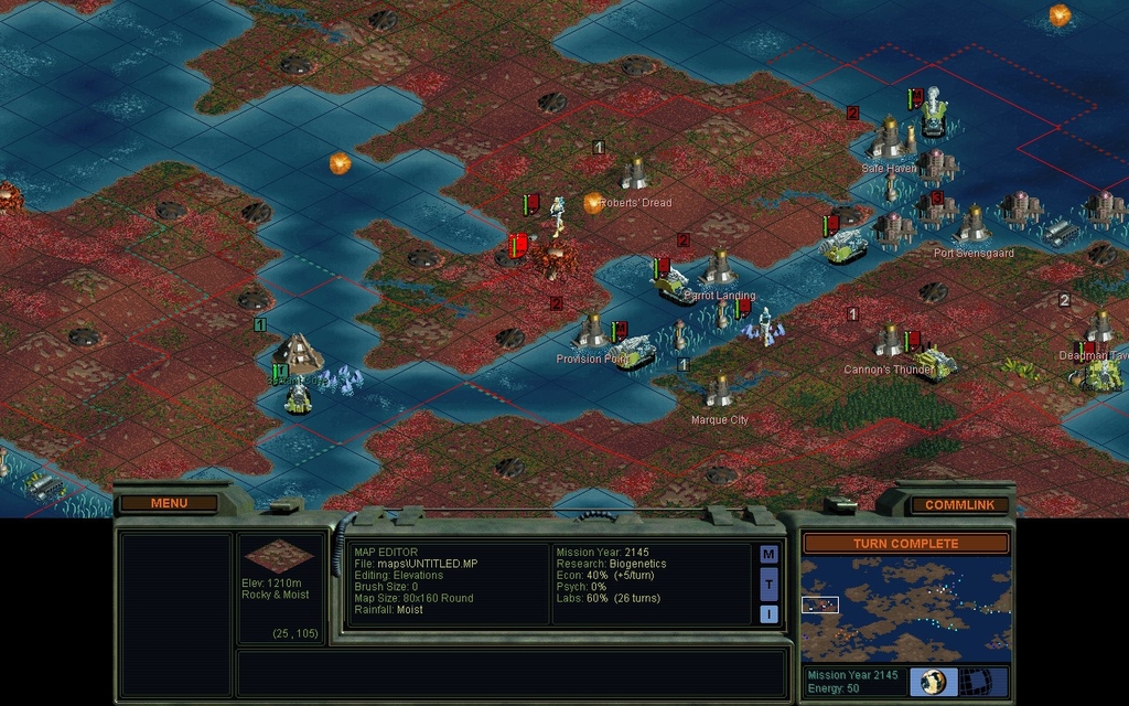 Now I will turn it over to the AI and just watch.  It can figure out what to do with the 2nd Sea Colony Pod.  I expect it will almost immediately settle a Port Svensgaard.  To get the AI going, I click Menu.. Scenario.. Activate Scenario Editor and confirm "Yes".  This of course reveals the whole map, so before I start watching, let's look at what other factions have done.