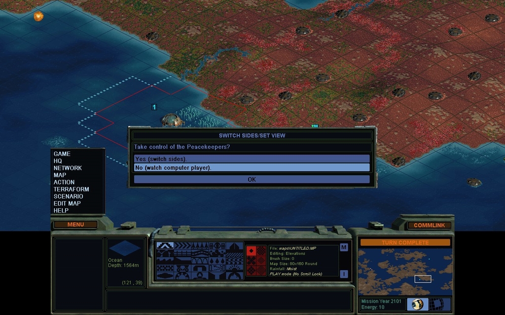 The next step in firing up the AIs, is to watch the next faction play its turn.  I select "Scenario... Switch Sides / Change View".  I pick the faction that goes just after the one I started with, in this case the Peacekeepers.