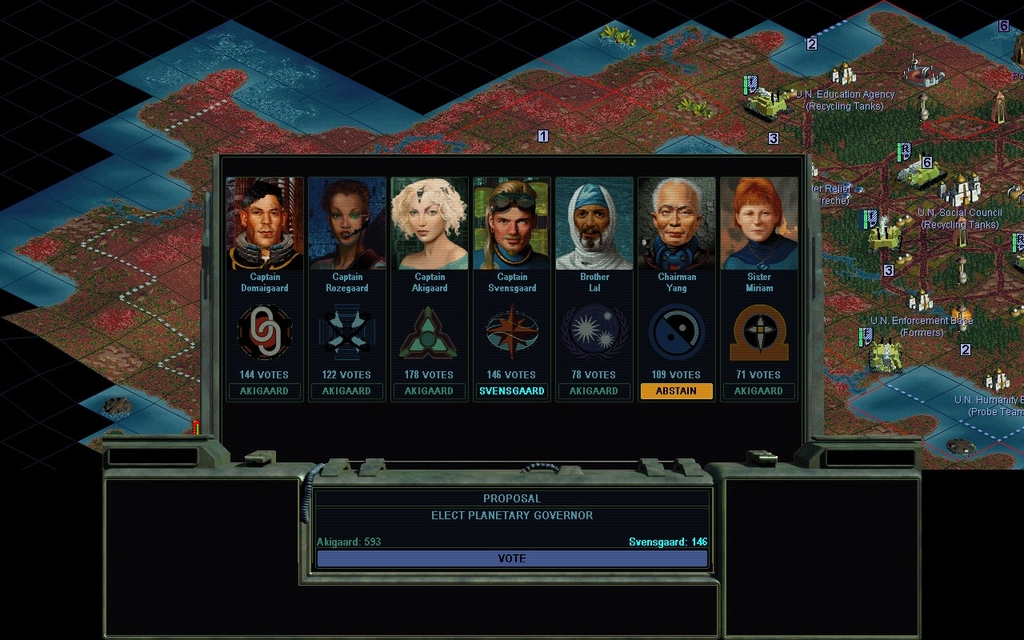 MY 2196.  I'm not sure why the -INDUSTRY Monsoon Jungle Pirates are such a popular choice, but obviously, the population boost of the Jungle made them one of the top 2 candidates.  The no penalty Pirate faction is 2nd, and the -INDUSTRY Pirate faction is just 2 population behind them.  The -INDUSTRY -SUPPORT Pirate faction has a noticeably smaller population, although that could be due to being blocked from land spreading initially.  They still have more than land factions do.  Yang is the best land faction and this reflects that he had an easier start, with more pods initially available, and better land to spread into eventually.  The Believers have done ok but are quite a bit behind the Hive.  The Peacekeepers are pathetic, as their vote tally represents 2X their actual population.  That's what failing to settle half of your starting civilization does to you.