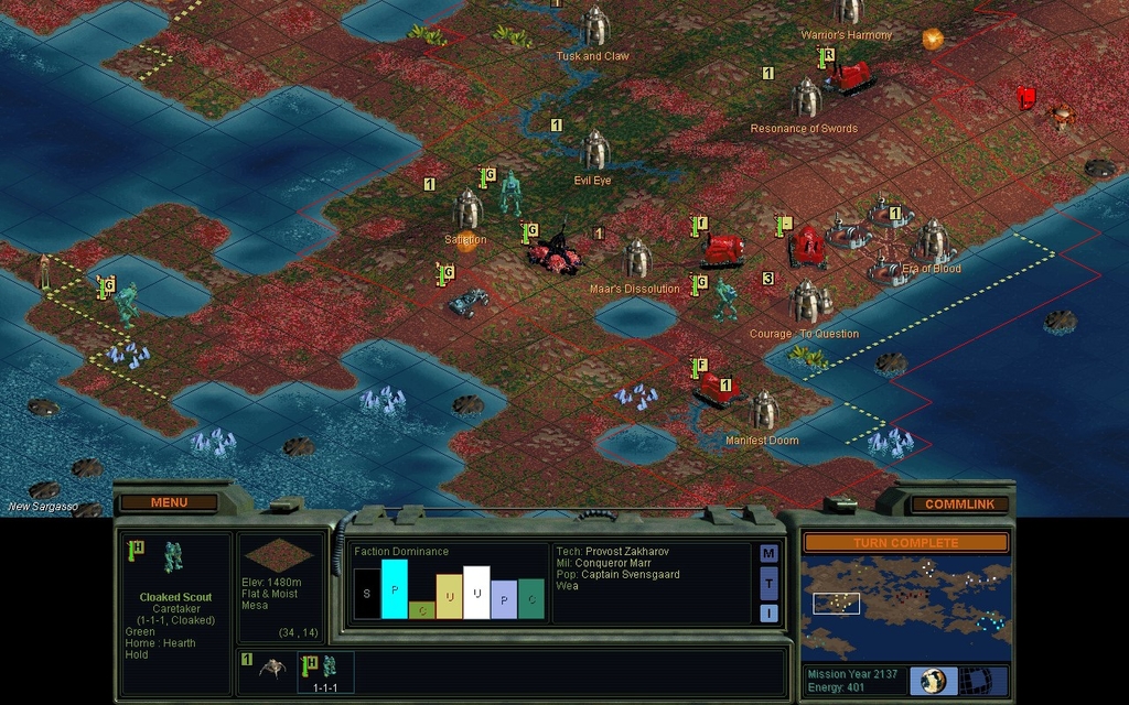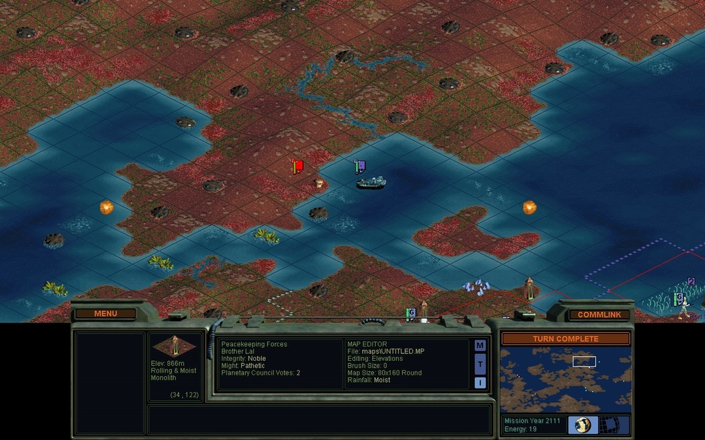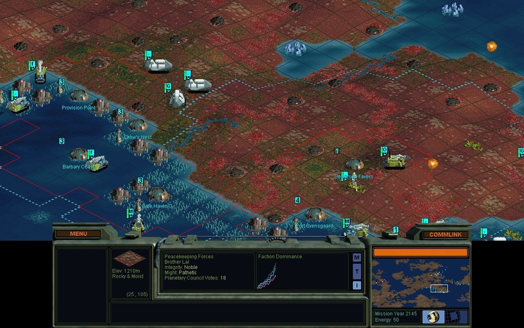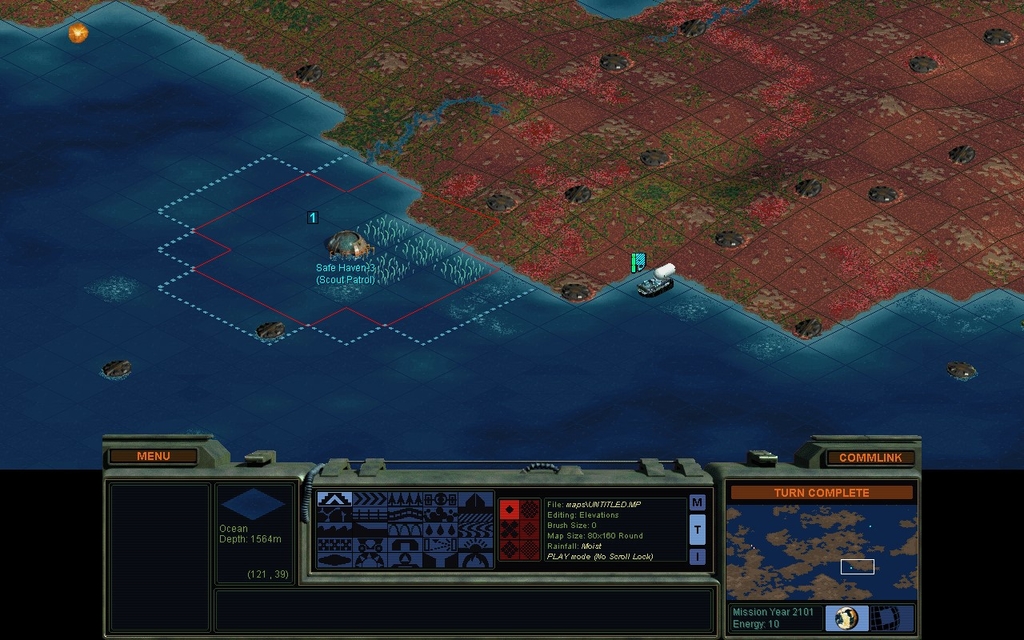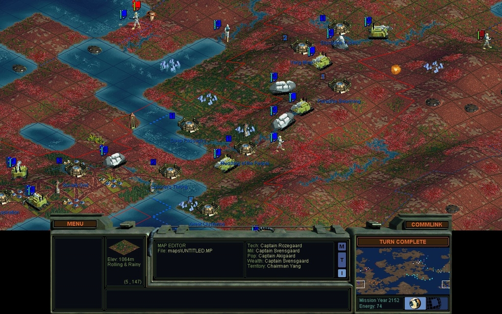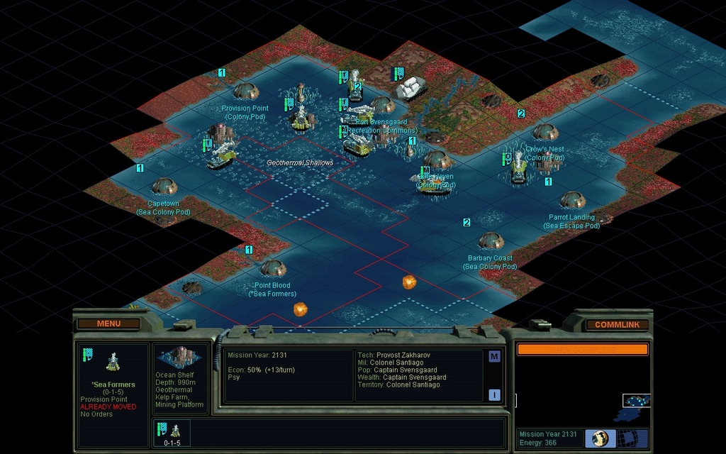 Now I will turn it over to the AI and just watch.  It can figure out what to do with the 2nd Sea Colony Pod.  I expect it will almost immediately settle a Port Svensgaard.  To get the AI going, I click Menu.. Scenario.. Activate Scenario Editor and confirm "Yes".  This of course reveals the whole map, so before I start watching, let's look at what other factions have done.