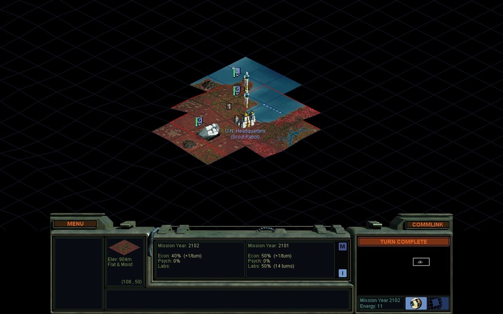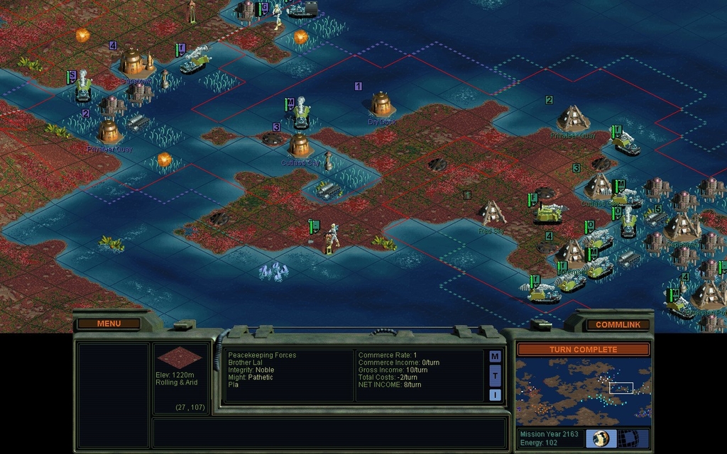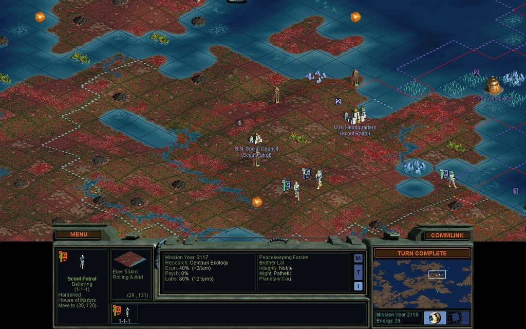MY 2116.  The Peacekeepers' 2nd colonist has milled around in the same spot for over a decade.  All other factions have at least 3 cities now, and some have 4.  This is clearly a bug, but what causes it?  It's not for lack of resources in the area, they've had plenty.  Did they feel threatened by the mindworm at large, and not realize they had the Scouts to deal with it?