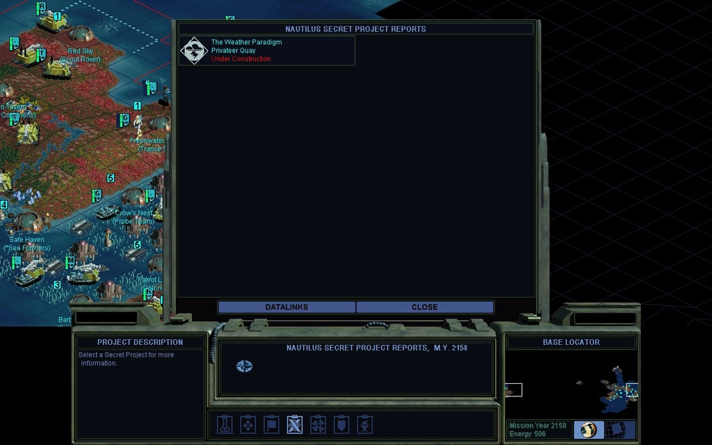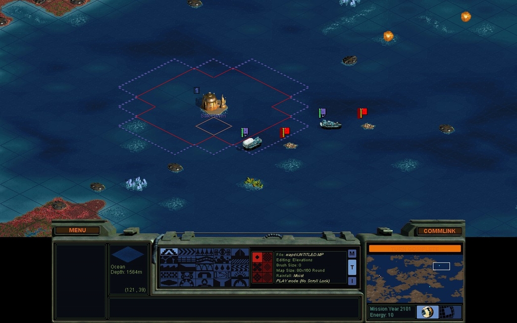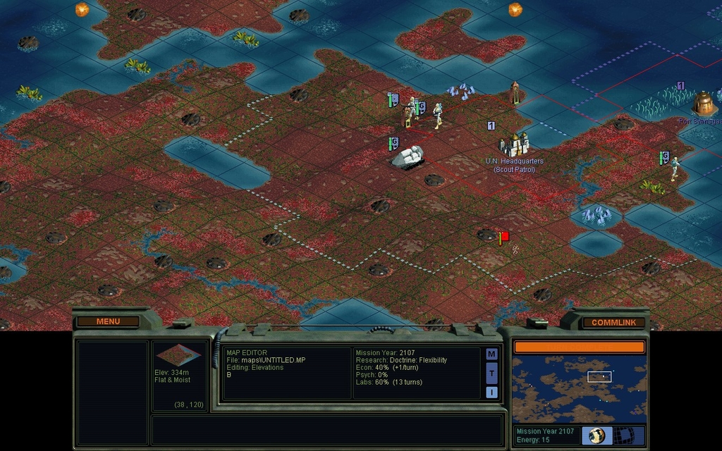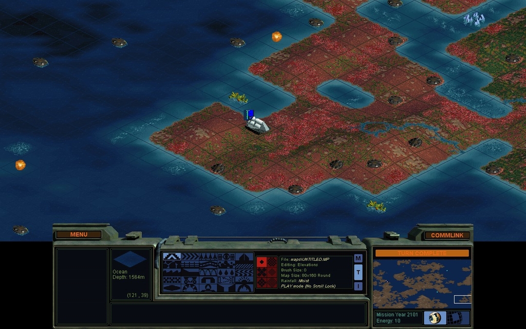 Now I will turn it over to the AI and just watch.  It can figure out what to do with the 2nd Sea Colony Pod.  I expect it will almost immediately settle a Port Svensgaard.  To get the AI going, I click Menu.. Scenario.. Activate Scenario Editor and confirm "Yes".  This of course reveals the whole map, so before I start watching, let's look at what other factions have done.