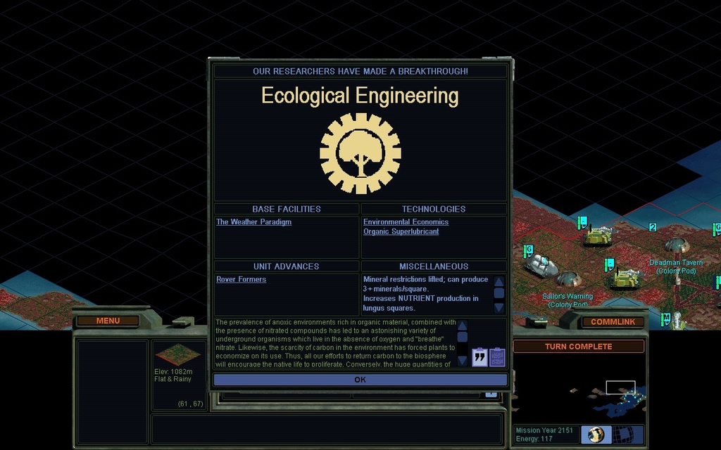 MY 2209.  Dang.  At some point the Cyborgs completed the Weather Paradigm and they're the 2nd weakest faction of the game, only in front of the stillborn Caretakers.  I did not expect that.  What was their secret?  The base that did it, Omicron Quadrangle, was fairly unexceptional with a 1-4-1 forest mineral boost.