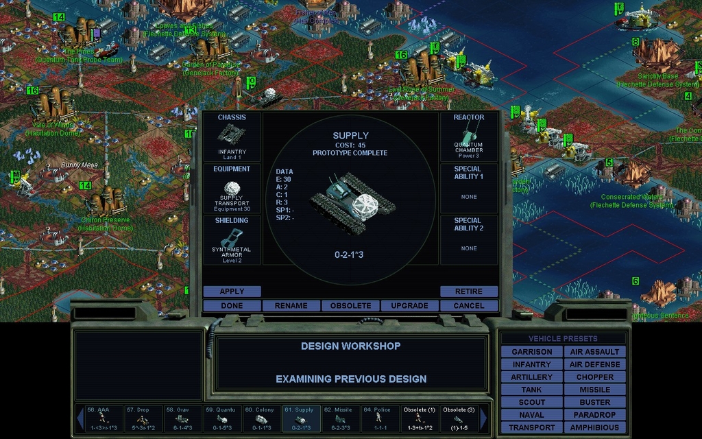 I'm rushing an AAA Neutronium Missile Infantry unit at my Skunkworks using those supply crawlers I didn't get to use for a Secret Project.  Roze just sold me Chronoton gun technology.  That's strength 16, my version of a Quantum Laser.  They're gonna be expensive to make and I can't even get garrison units done, with my feeble (!) Genejack Factories.  I clearly don't have time left in the game to build better factories either.  One might even wonder if I have time to build heavy duty garrison units.  I just have this paranoia that someone's gonna start hitting me with Conventional Missiles at any moment.  I built a Flechette screen everywhere against that eventuality, but fat good it's going to do me with Green Trance Scout defenders!