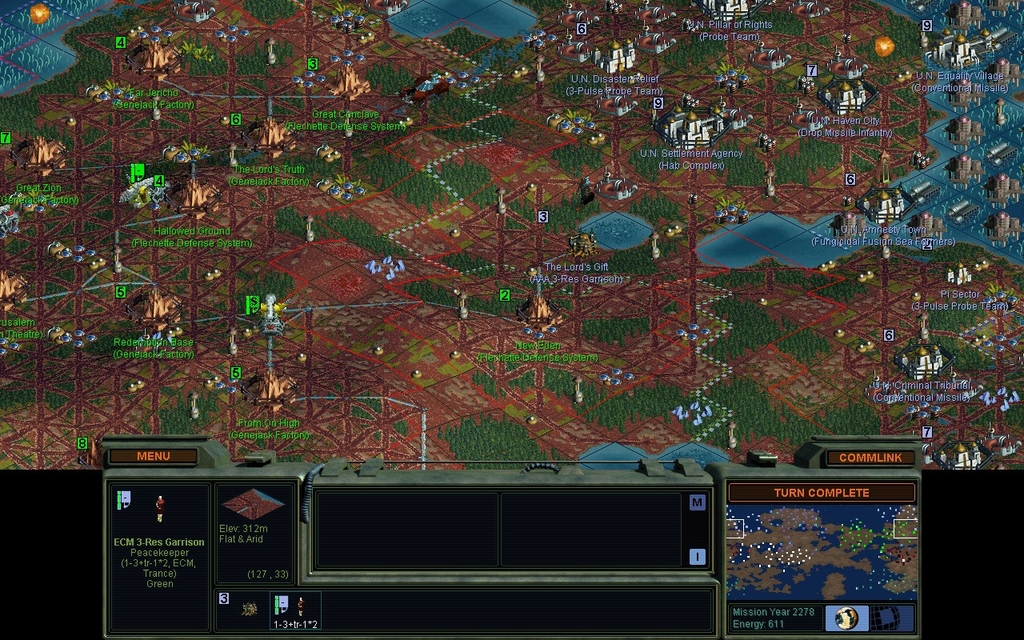 I lose a mindworm fighting the Peacekeepers.  When the heck did they build the Neural Amplifier?  Looky looky, it's the only thing they did build.  Hm, ok, UN Haven City.  I think I could cut a path to that before calling it quits.  Sucks to not have my mindworms work though.  I start by taking back my city, using some Infantry so that I don't suffer any penalties for ECM or Psi attack.  We'll see if they splash me with more probe teams next turn.  I begrudgingly move my Fission Impact Needlejet air force towards the front, as it will help with probe team elimination.  Lal is using a lot of the 3-Pulse armored probe teams.