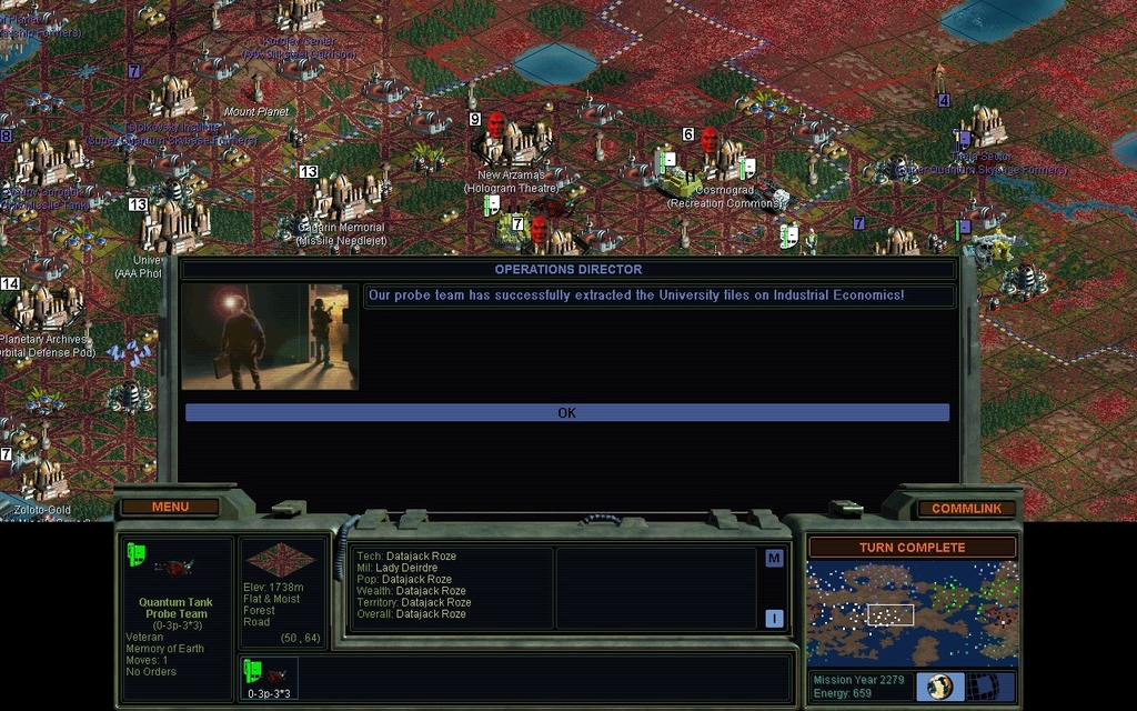 MY 2270.  The University thought it would be clever to subvert this Spartan base.  It's actually a liability for them.  I steal a tech, but there's a lock on the base and I lose my team.  I'll let Santiago worry about conquering it.