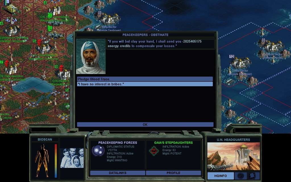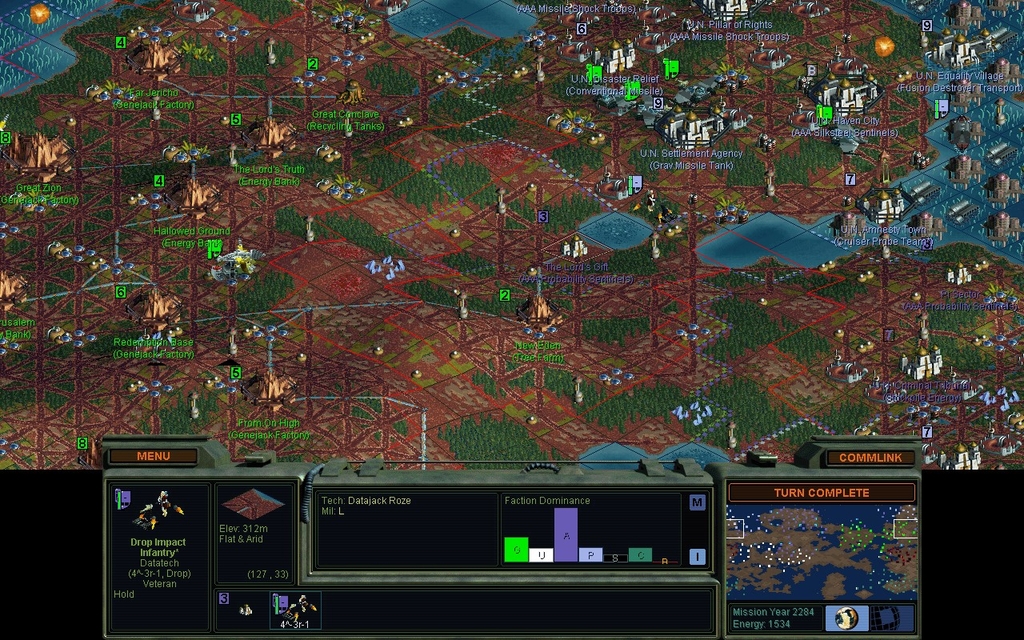 The Peacekeepers subverted one of my border cities last turn.  In a curious turn of events, the Data Angels subverted the subverted city.  Well I guess now I don't have a border problem there anymore!  UN Haven City has also been left wide open.  I believe I can air drop into it.  In fact, I can orbitally insert anywhere on Planet, I sort of forgot about that.  Wanna bet an Aerospace Complex is going to get in the way of my drop though?  Yep, it's got one.  But I think I can pass a Hovertank into there.