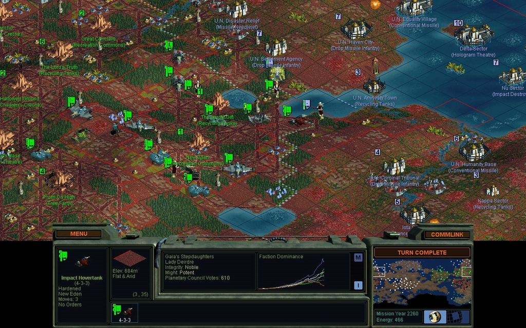 MY 2251.  I think if the Data Angels and others hadn't given me free military units, and I had to wait to build such things myself, I'd be bored silly right about now.  I'd be watching the other factions whomp on the Believers and gaining a little ground here and there, while I just work on my pop boom.  Mostly this is all I'm actually doing right now anyways, plus air harassment of the Believers, and dropping into an empty city when someone else leaves it weak enough for me to do that.  From where I sit it's a low intensity war, just waiting for an enemy to gradually collapse.