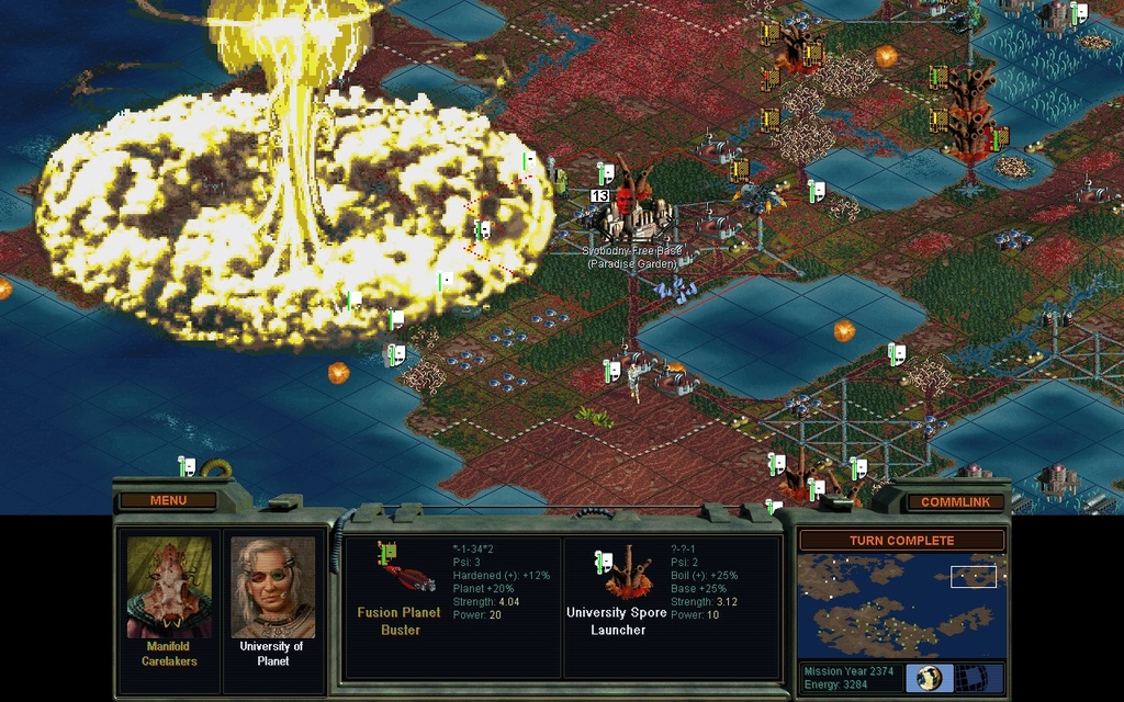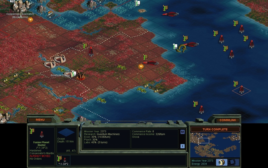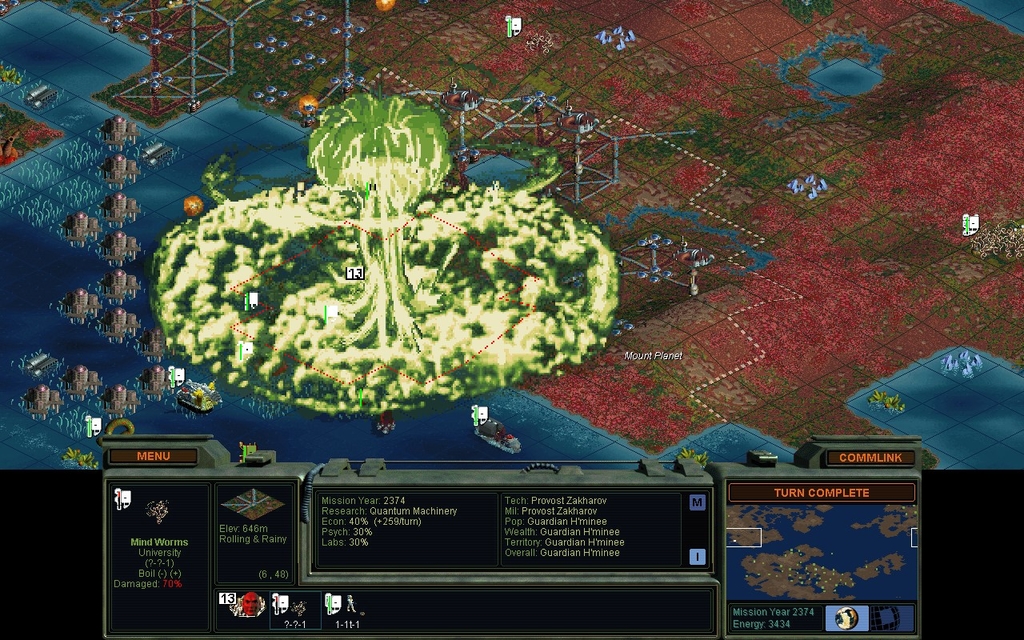 I'm nervous because even cities with a Temple of Planet in them, are now doing things like 78 eco-damage.  131 eco-damage is more typical in other cities.  If this game goes on, Planet is going to kill me.  I took the precaution of having most bases build Quantum Trance 3-Res Phaser Squads, which should hold up ok to at least some mindworms.  And I do have the Neural Amplifier.