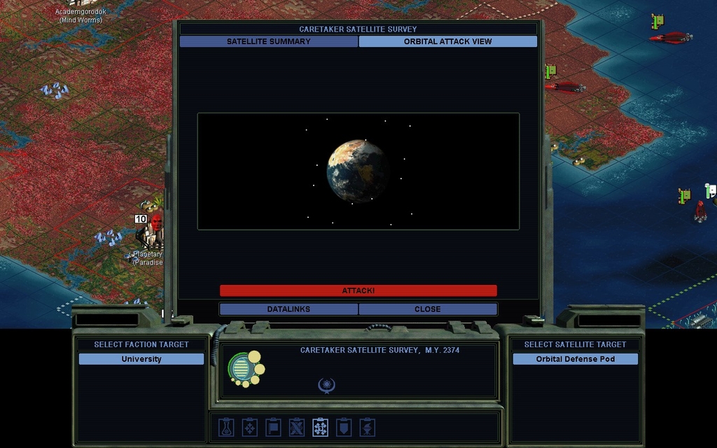 MY 2373.  The University has researched Biomachinery and has started on Sentient Resonance.  I have achieved the minimum necessary odds for orbital supremacy.  Additional ODPs would be good, and would bring the endgame to certainty.  Given that I'm now actually slightly beating the University on tech, it would probably have been faster overall if I'd pursued Subspace Generator technology and called in the Alien fleet for victory.  It didn't seem that way at the time though, and the game would have been long since over if the AI hadn't had the temerity to put up an ODP screen!