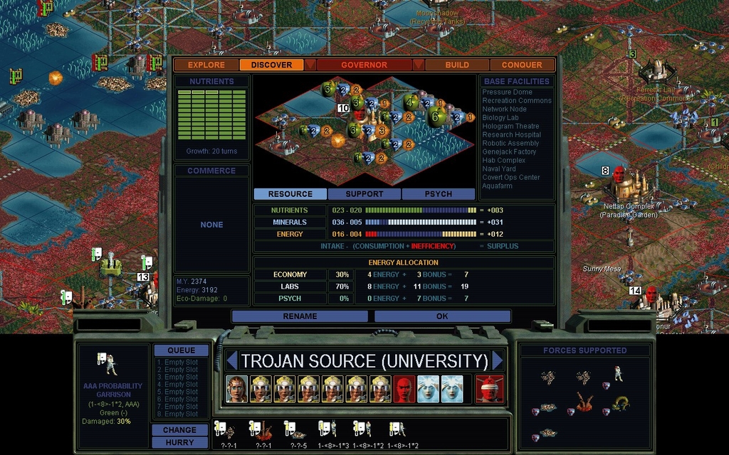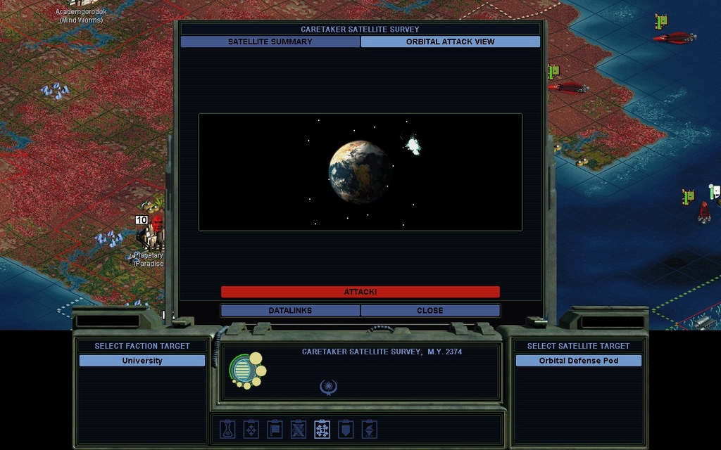I ride around on the available rail network to see what sort of opponents I'm facing.  The bulk of the University's army is far and away a pile of indigenous life forms.  They have 108 mindworms, 4 in production, and have lost 40.  Spore Launchers are equally excessive at 100 active, 3 in production, and 61 lost.  They can be good weapons, but they chose Democratic Capitalist Knowledge Cybernetic for a net -1 PLANET rating.  I'm the one who got all the lifecycle buffs via the Xenoempathy Dome and the Pholus Mutagen.  They do have a Biology Lab in every base, but they only built 1 Centauri Preserve.  Generally speaking my mindworms seriously outclass their mindworms.  Their one saving grace is they built the Dream Twister.  I built the Neural Amplifier so they cancel out.