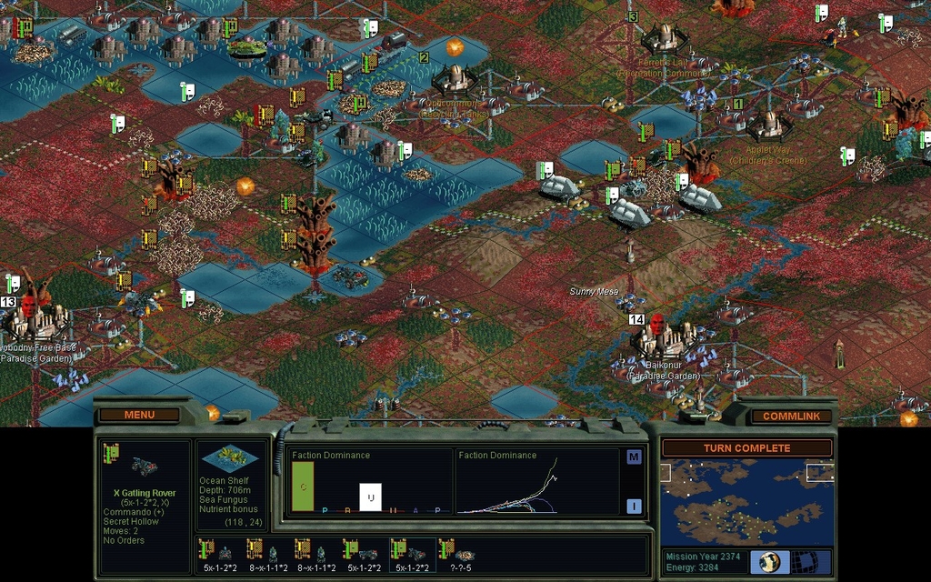 I now have 3194 credits in reserve and an income of 420 credits/year.  I wonder how much it would cost to buy one of his Secret Project cities?  They're right next to his capitol, so probably more than I'll ever want to afford.
