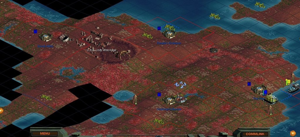 I started on Flat Moist land, and none of the land around me looks particularly wetter or better.  I'm next to fungus but I'm not supposed to be afraid of that this game anyways.  I just took the square as my base, to get on with it.  I send my Colony Pod down river, as if nothing else it'll move faster, provided it isn't a fungus covered river.  Mindworms have an awfully high chance of showing up on fungal river squares in my experience.  I'll pop the pod once I've got an expendable Scout to throw at it, coming next turn.  I do have +1 SUPPORT so can spam Scouts better than other factions can at the beginning.