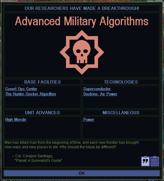 MY 2229.  I learn E4 Bioadaptive Resonance, which in my mod gives the Neural Amplifier.  I start building it.  Since I've made it this far into the game without really coming into direct contact with my enemies, I'd really like to have it.  It's going to be key technology when the world floods.  I might even go so far as to say, if someone beats me to it, I'm going to have to conquer them first.