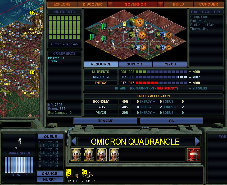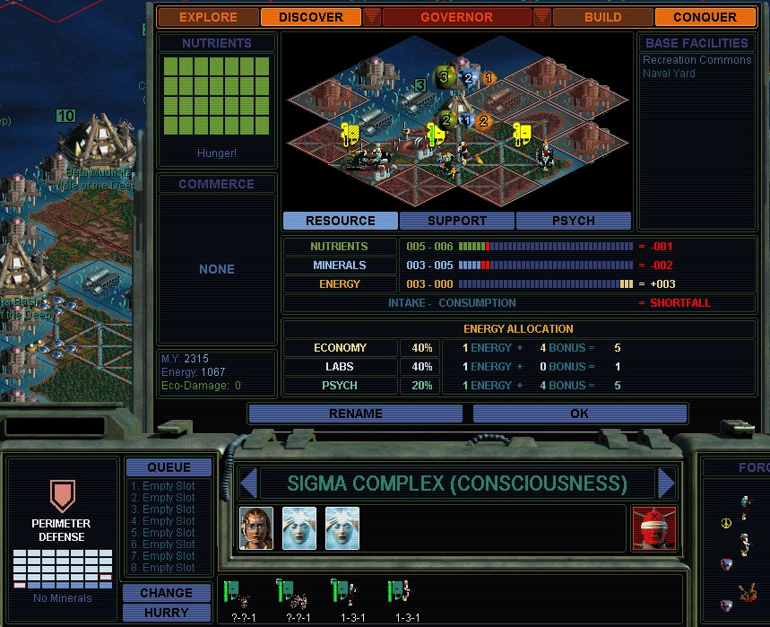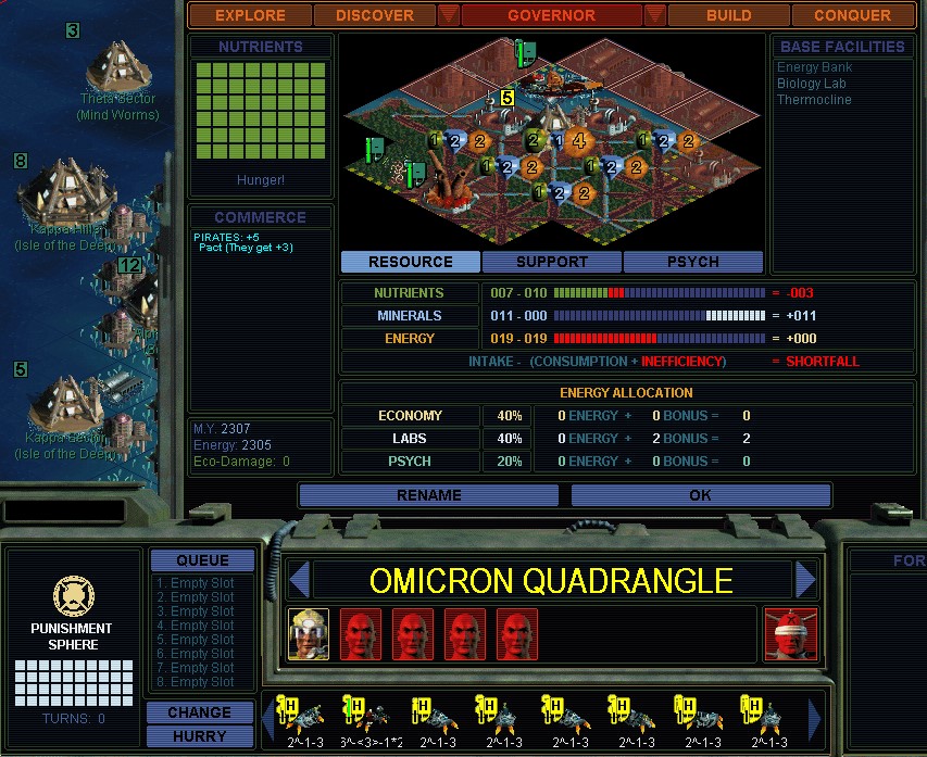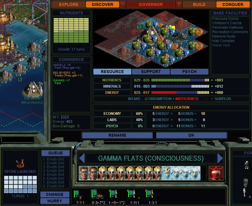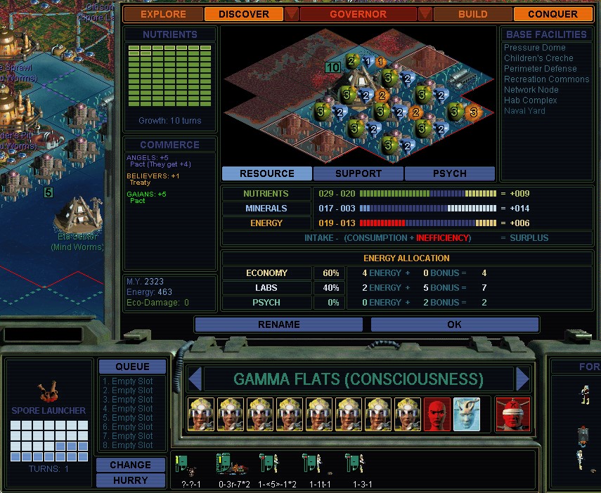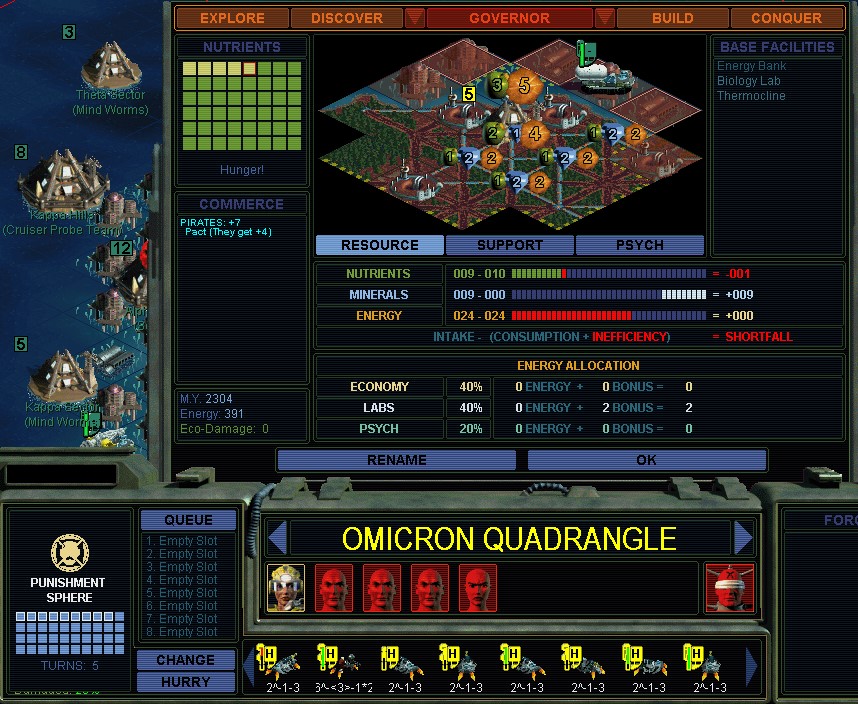 I know how I talked about being a greedy capitalist Planet polluting pig to the bitter end, but it's just not realistic.  I don't need a mindworm apocalypse in my backyard right now.  I've also got bigger factories coming in every city and there's going to be lots more eco-damage.  It's question of scale.  The Cyborgs also have lots of mindworm defenders.  Cleaning their clocks would be very useful as part of the invasion plan.  The balance sheet is clear!  We're going Green.  I only lose 50 credits / year doing this for some reason, maybe because I don't have enough Treaties, maybe because JUSTICE goes up.  Research rate is unchanged, and frankly I don't need any.  I just need to stop the Cyborgs from learning new stuff and threatening to build yet another Secret Project.