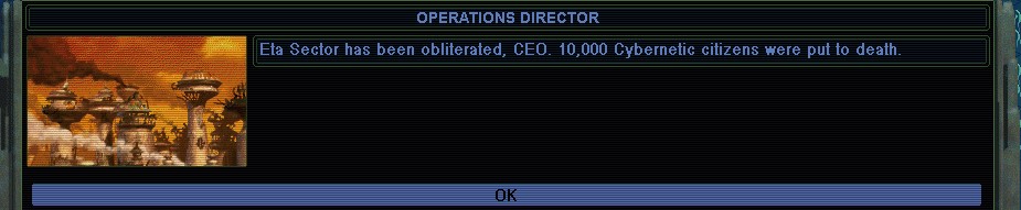 In my haste to fight all of this, I forgot to steal the bonus tech that the Cyborgs got.  I hope I don't get overrun next year.  I just don't have anything to reinforce with.  All of my production is going into Robotic Assembly Plants, and then Brood Pits to make people happier.  All of my money is going into beating the Cyborgs to finishing the Secret Projects that they get.  I may have more production, but it isn't enough production to make me a terrifying force yet.  My tactics so far were definitely worthwhile from a theft and softening defenses standpoint, as I've destroyed a fair number of Perimeter Defenses.  But an effective invasion, so far this is not.