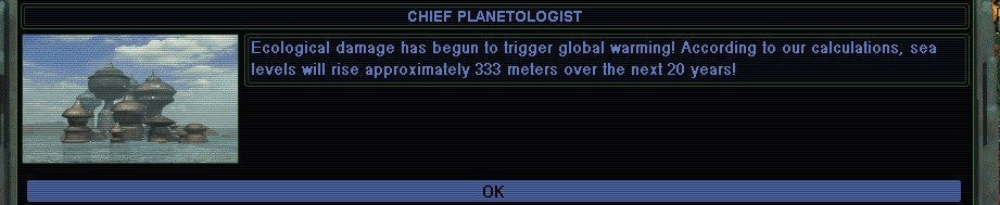 MY 2318.  This is what I get for taking time out from my busy conquest to build Temples of Planet??  This is pretty baloney unless the AI actually is counting my chemical attacks as eco-damage.  But I have not seen any eco-damage numbers rising in my cities, so I don't think that is happening. I don't quite know for sure though.