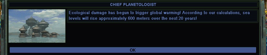 MY 2318.  This is what I get for taking time out from my busy conquest to build Temples of Planet??  This is pretty baloney unless the AI actually is counting my chemical attacks as eco-damage.  But I have not seen any eco-damage numbers rising in my cities, so I don't think that is happening. I don't quite know for sure though.