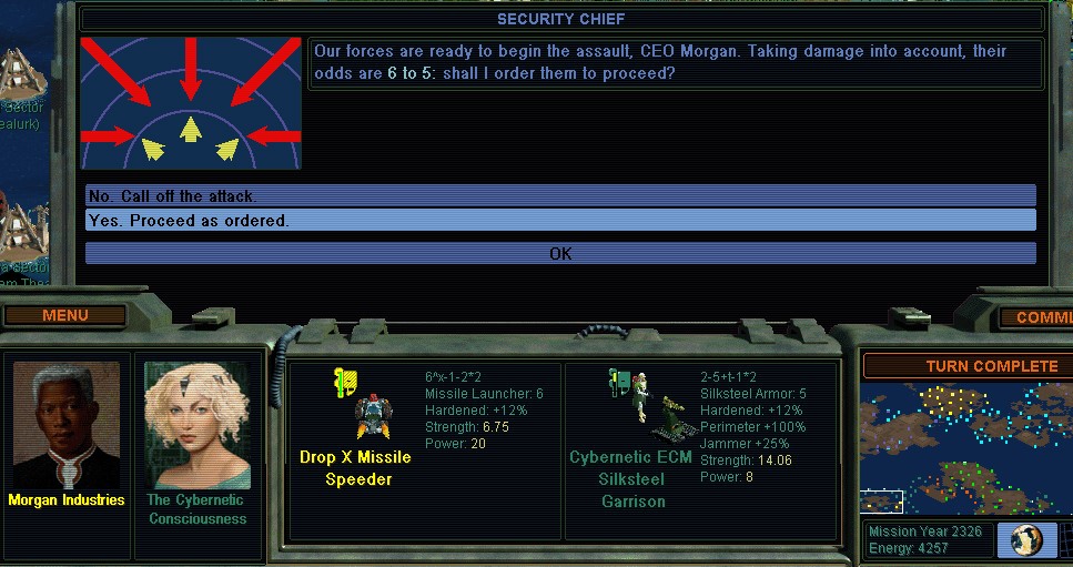 MY 2326.  The Cyborgs foolishly complete a raising of Tau Collective from the water.  That was my next conventional target and it was much harder to get to in the water.  Maybe there are benefits to ignoring enemy Formers for awhile?  I make my assault.  They are well defended and although I weaken them, they hold and my attackers die.