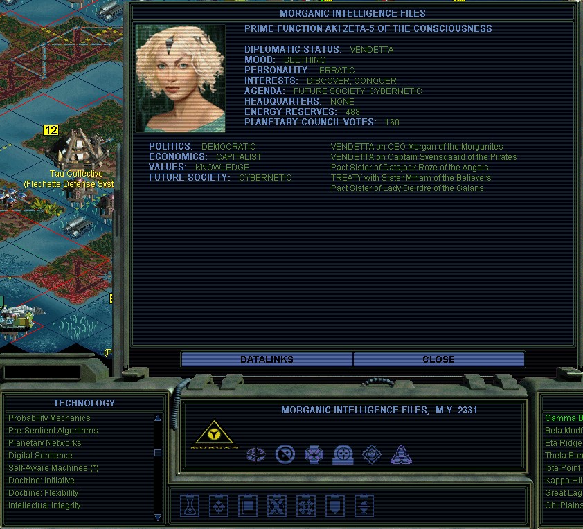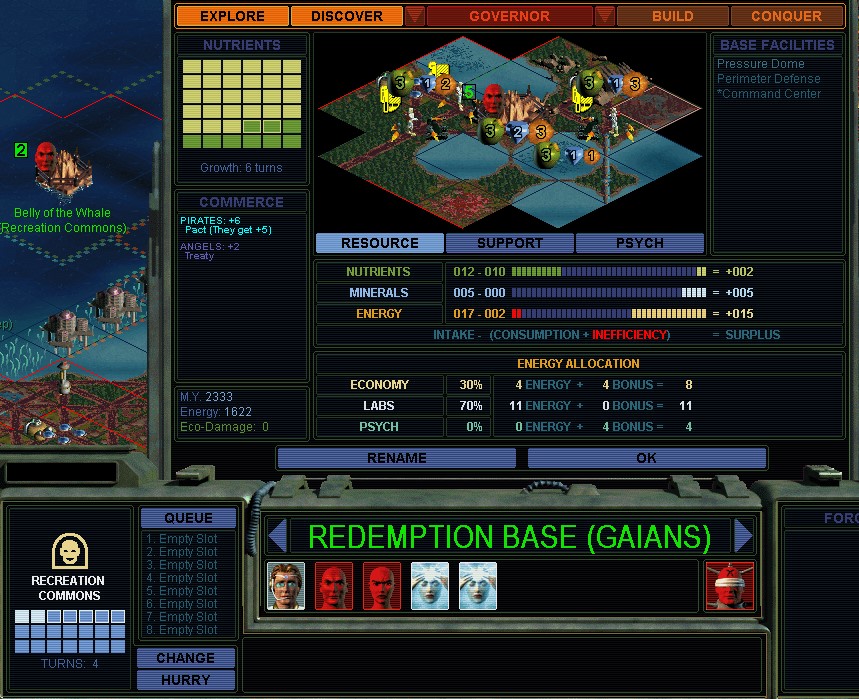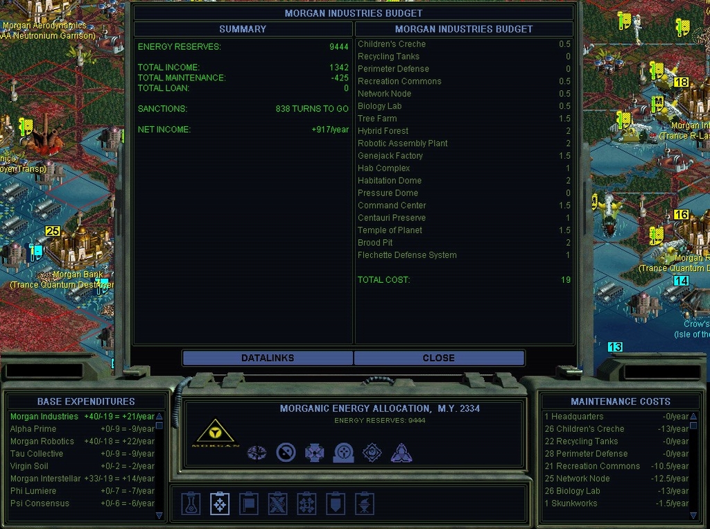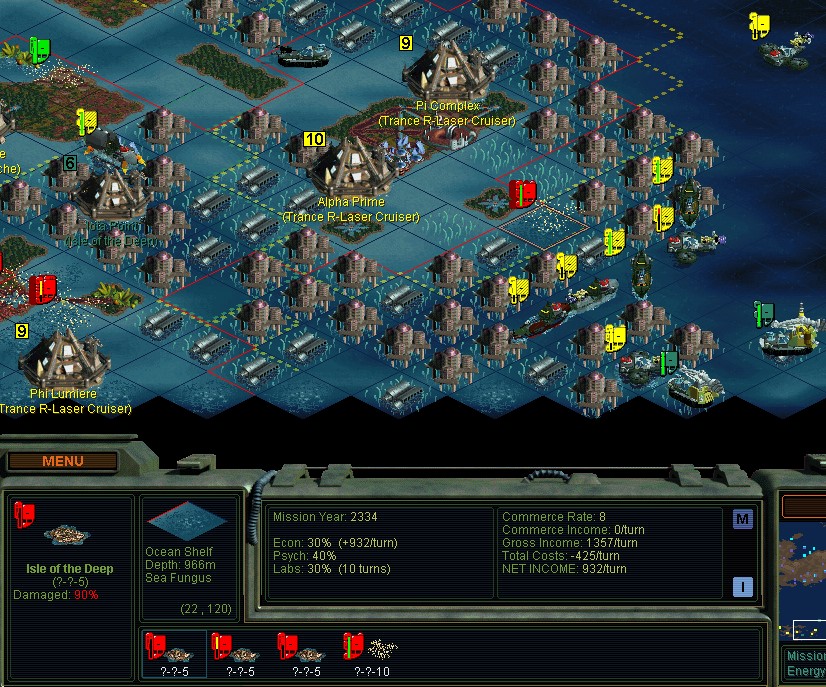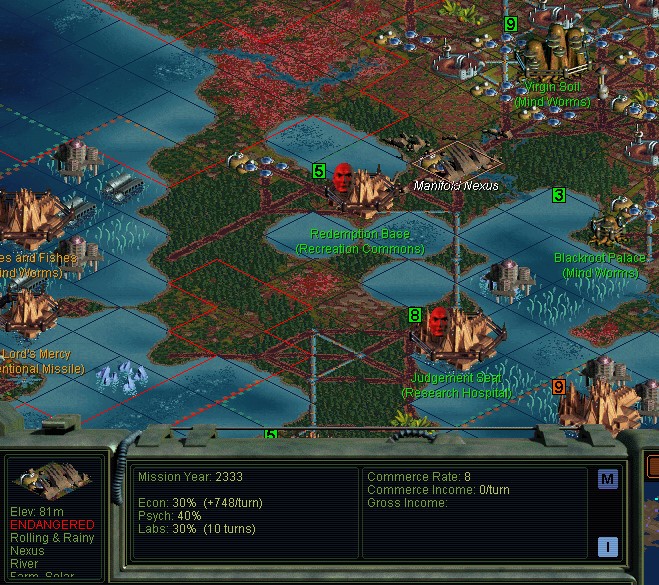 MY 2334.  Plenty of ineffectual Pirate attacks against my Sea Formers.  Some Gaian counterattacks against my units in field.  No fungal pops and no notice of any new, profound flodding levels.  This is just the same-old same-old?  I hope there isn't some bug where I'm not going to be warned about how high it's going to rise!  What if my building of the Manifold Harmonics has made me safer from Planet?  Or controlling the Manifold Nexus?