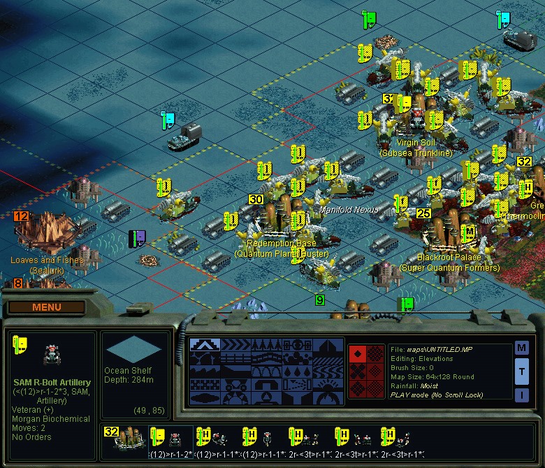 Disappointed that only 1 person has had any comment on anything I've written.  That's not exactly encouragement to keep going, or to believe that there's an audience for the vast amount of work that a writeup like this takes.  Supply and demand, eh?  I definitely have other things I could be doing with Life.  Even if SMAC oriented, I'd sooner play and write up a new game with lessons learned, or try to tweak the AI's play yet again.