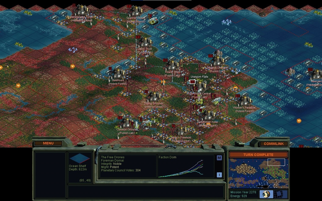 It is MY 2186 and the Gaians have generously decided to grace me with an alliance.  They started the game at war with me, lol.  They were too far away for it to be an issue, and so I'm now on a relentless campaign of crushing the Pirates, who are right next to me.  In this time, the Gaians have built one Trance Former beyond the 2 Formers given to them at start.  And they started the game sitting next to the Monsoon Jungle with no competition, giving them no developmental excuse.  Their developmental trajectory is pathetic for the land resources they were given.