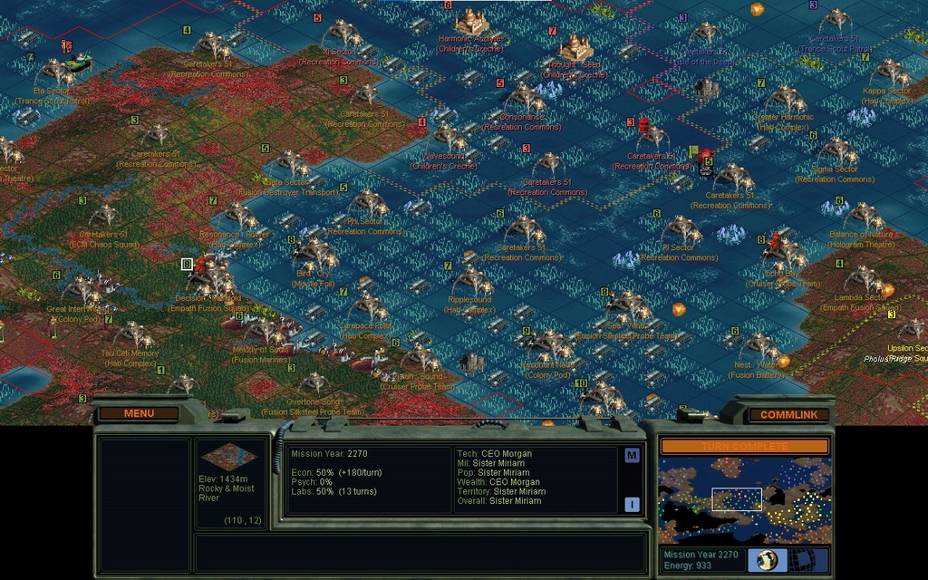 III) One of the most disappointing things about AIs is how they use air units. They just move them between bases, very rarely doing anything except take potshots at an occasional former. They never use them to ruin terraforming, and are very conservative about attacking. I noticed two options on the right-click menu: placing units on Alert, and ordering Bombing Runs. Placing air units on alert makes them either wait at the base, patrol inefficiently in a very small radius, or attack occasional unit with no rhyme or reason (a copter attacked a few passing cruisers, but ignored most of anything else). A bombarding run made jets attack a base... sometimes, and copters just move close to it and crash land. And stay crash landed indefinitely... or at least for 10 turns. That's not just weird AI, that's a violation of the rules - choppers are not supposed to have enough fuel to do that. Half the time ordering a bombarding run made units just skip their turns forever.