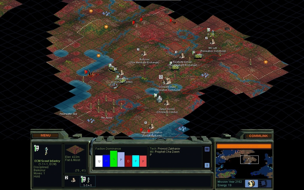 I started surrounded by a bunch of fungus, between what is now University Base and Koppernigk Observatory.  A mindworm immediately popped from a pod where the energy special is, blocking my way to the north.  So I went south.  The land otherwise turned out to be rather fertile, and I also triggered various solar collecting specials.