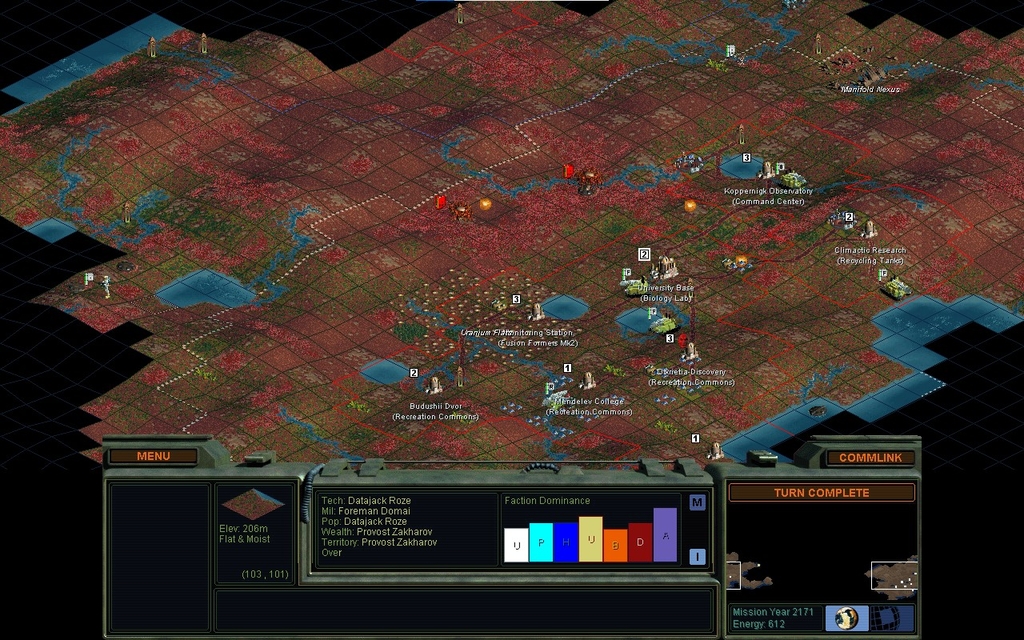 This time, I have played primarily to increase energy, although also spreading for awhile.  I tried to set up Completions for Biology Labs rather than Recycling Tanks, on the premise that they're cheaper to maintain and more directly beneficial to the University.  I did not try to complete a Command Center, waiting instead until I had some big mineral deposit cities to start making one.