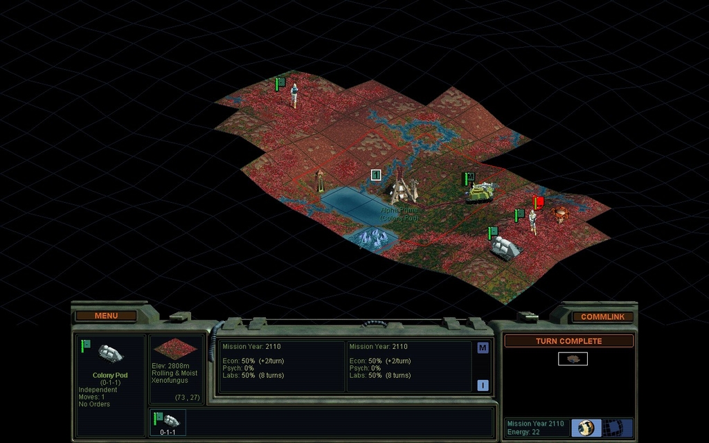 My starting location was reasonably lush, and I popped a minerals bonus immediately.  That made it a no brainer as to where to put my capitol.  However it was not obvious which way to go with the 2nd colonist as I had a lot of fungus around.  It was clearer than shown in the screenshot.  Up north, I explored the river system with my Colonist, but all I saw was dry scratchy land.  I used the roads I had created with my Formers to turn to the southeast.  I had a viable settlement spot, right where my Colonist currently is.  But in MY 2110 I popped 2 pods and got 2 fungal blooms, cutting me off to the northwest and southeast.