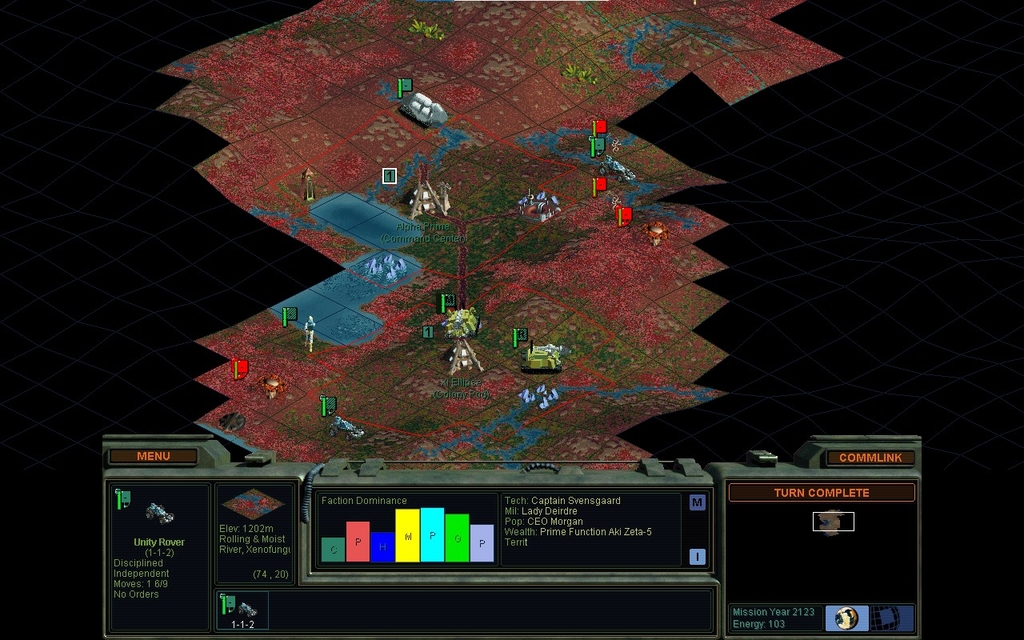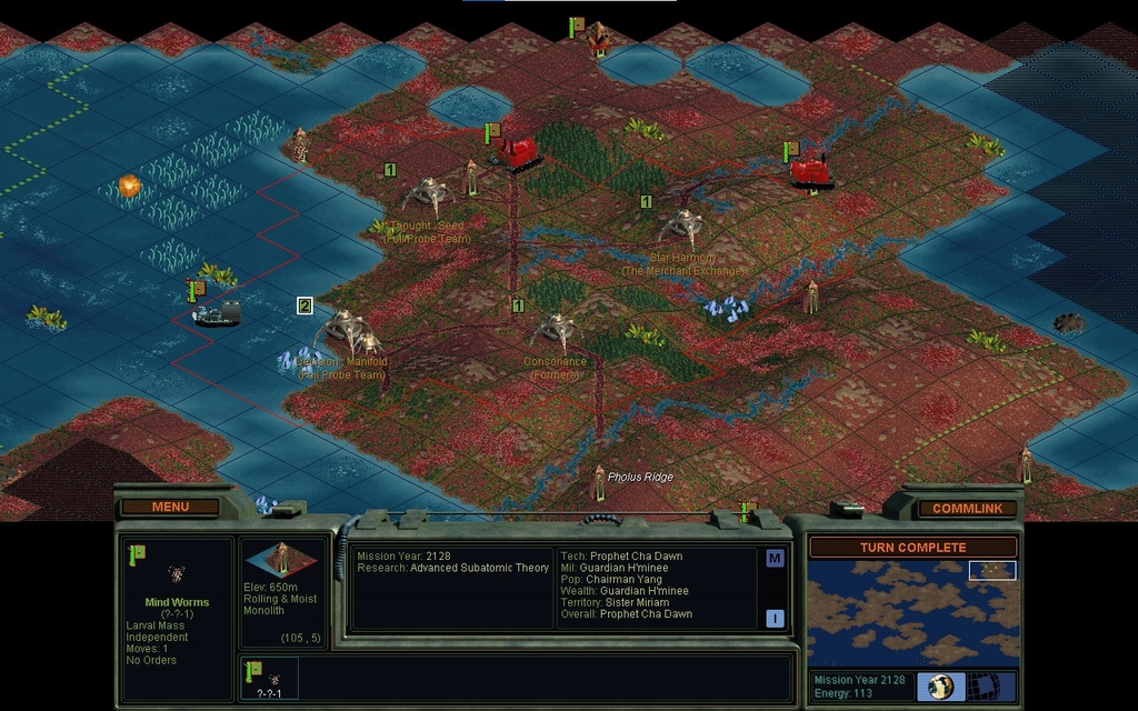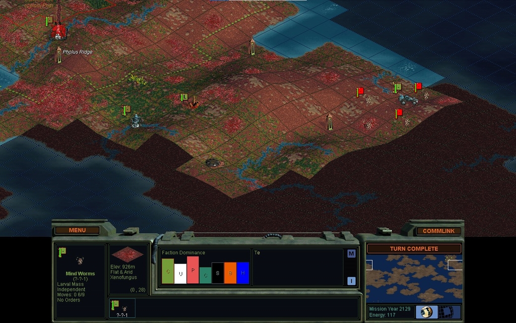 I cut a hole in the fungus to rejoin my cities.  So far the fungal barriers haven't proven to be a dealbreaker, but they did have the effect of delaying my 2nd settlement quite a bit.  Consequently, MY 2123 is too soon to be being whacked by double mindworms of normal deadliness.  I saved the game and looked at the odds calculator.  It said I had a 74% chance to win, but based on previous experience with these events, I didn't believe it at all.  Sure enough, I died.  On a 2nd run I did kill the 1st worm, but took 90% wounds, so the 2nd worm will surely wipe me.  And of course it has spawned right next to the Mine that I painstakingly built on my 1st mineral special.
