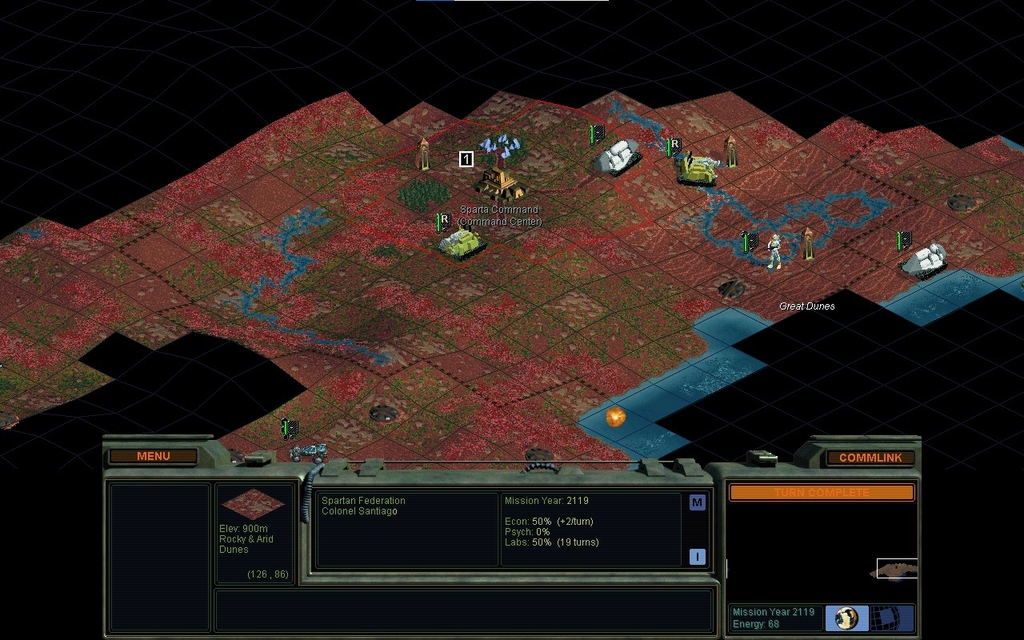I found I was on a sort of island, barely attached to another land mass.  It took me pretty much forever / the worst case / last place I looked, to find that land attachment.  The island was smaller and quite dry to start with, but an earthquake raised land to the east and improved the raininess.  Monoliths came rather late as I pushed my many Scouts around.  I was unable to Complete any Command Center, despite much trying.  Tech progress has been very slow as I've only had 2 cities this whole time.