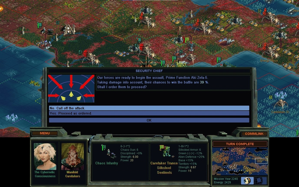 MY 2240.  2:30 AM.  This is the point at which I quit.  This war with the Caretakers has been like watching paint dry.  They are not effective, but bringing up my units without mag tubes takes forever.  I resisted building Genejack Factories for fear of environmental damage and unhappiness, so my unit output has been so-so.  They have all these silly defense bonuses and I'm quite convinced they have to go.  Earlier I was Green, but it took a sheer pile of captured mindworms to do any damage.  Eventually they all died and I went Planned.  That actually proved to be somewhat a mistake for my empire stability.  It's just all a dead bore, and made more remarkable by the Caretakers' utter inability to take advantage of my own weaknesses.  I think the AI must be horribly confused by all its city spam.
